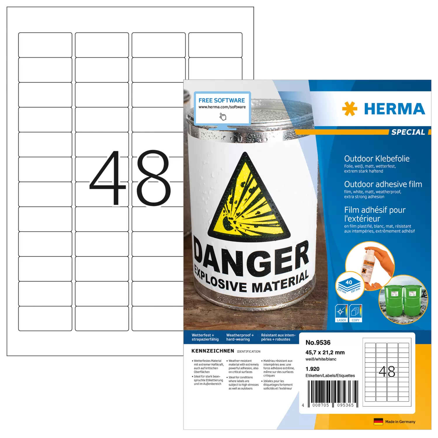Weatherproof outdoor film labels A4, 45,7 x 21,2 mm, white, extremely strong adhesion, stretchable