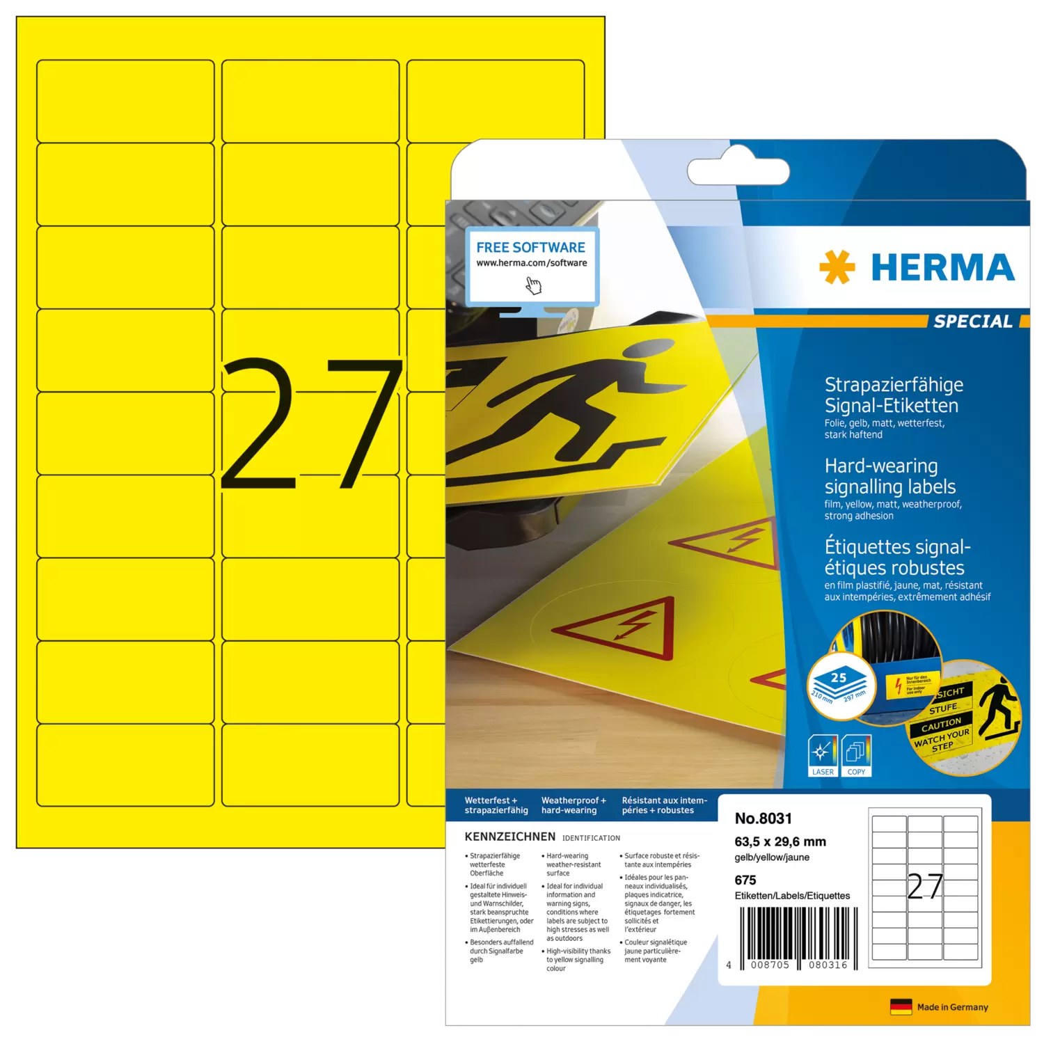 Weatherproof film labels, yellow A4, 63,5 x 29,6 mm, extremely strong adhesion