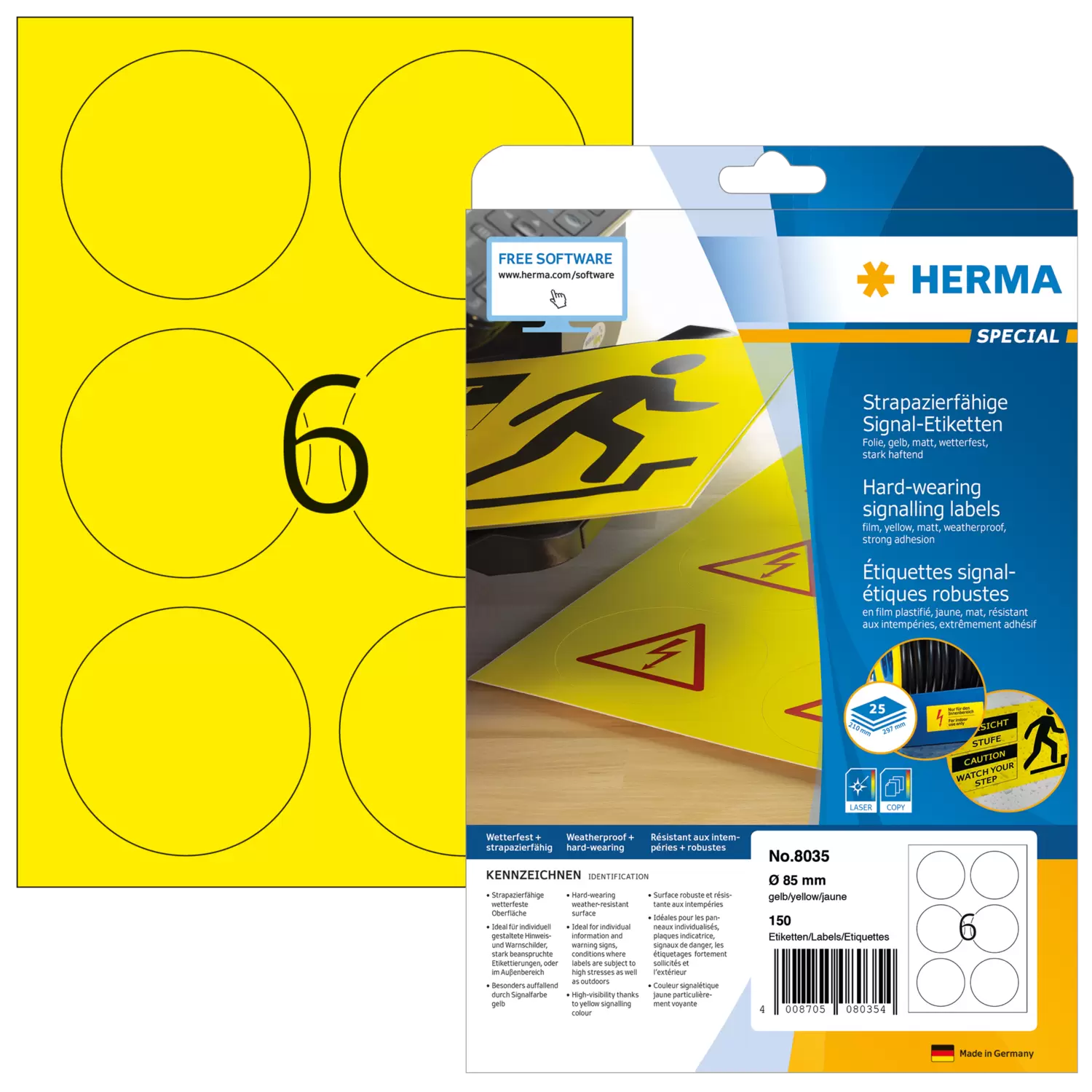 Weatherproof film labels, yellow A4, Ø 85 mm, extremely strong adhesion