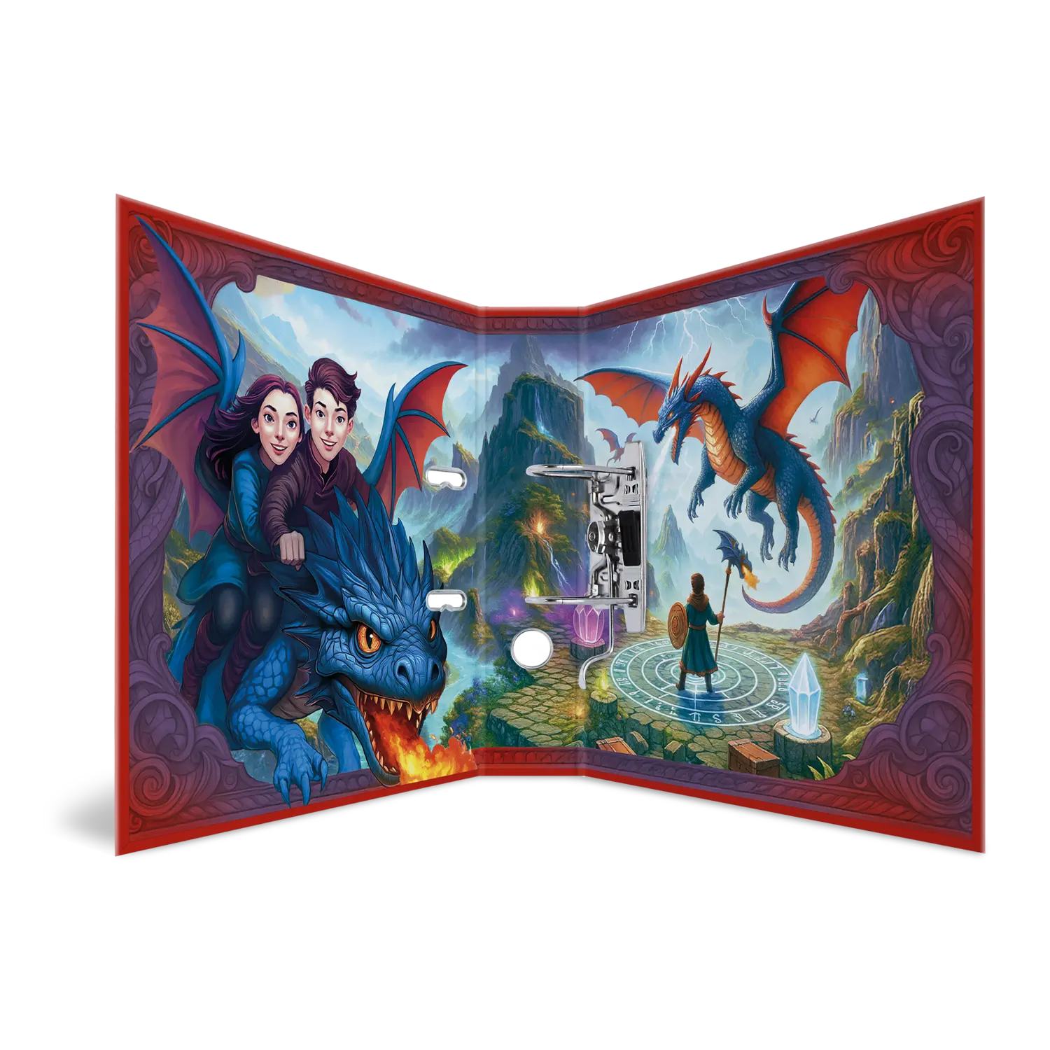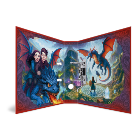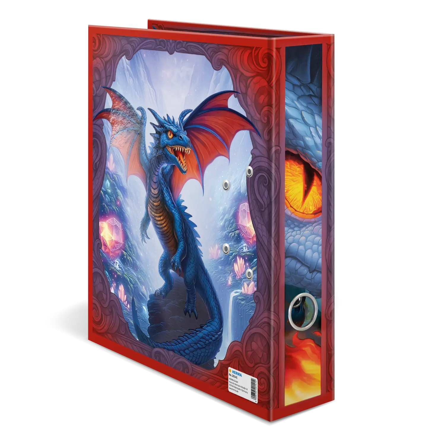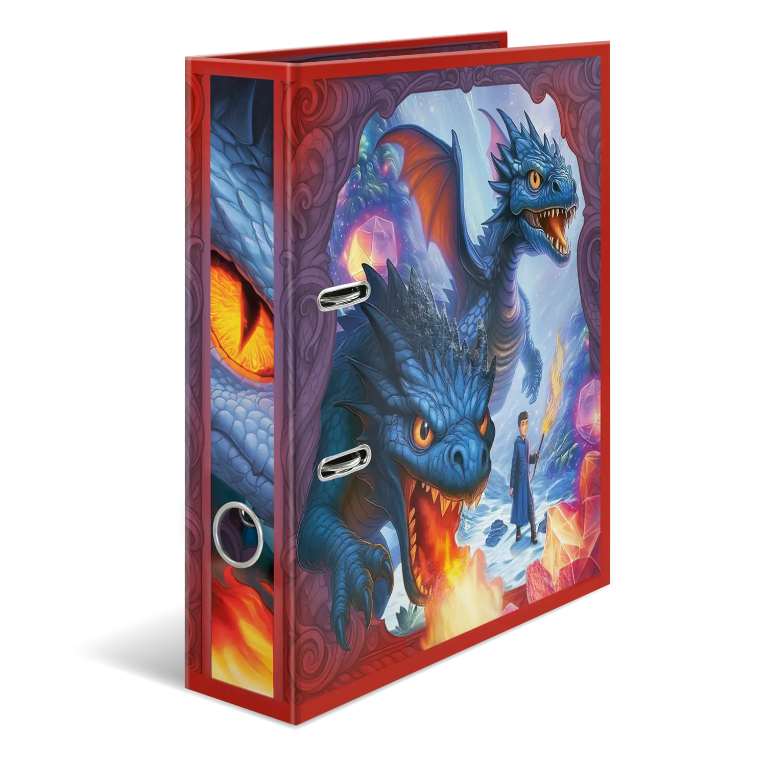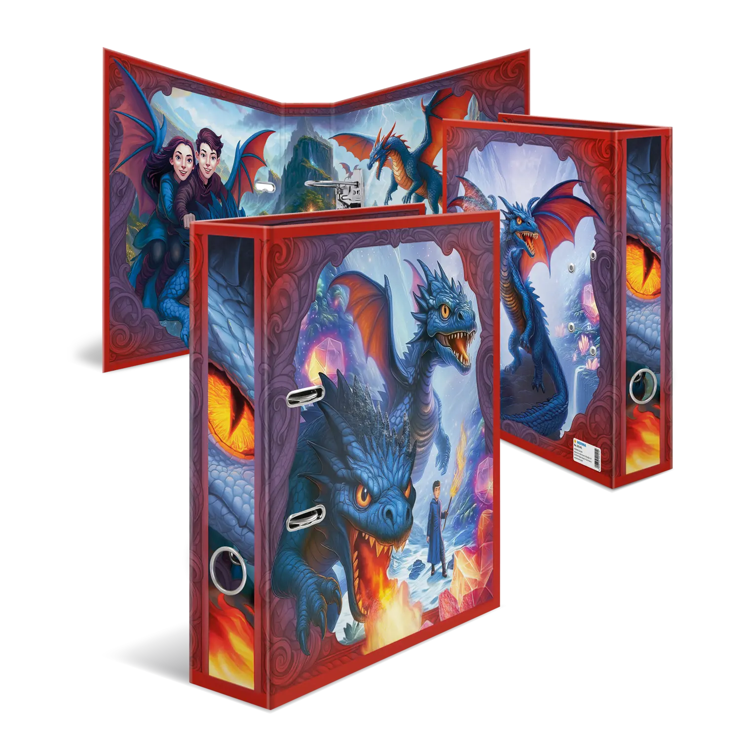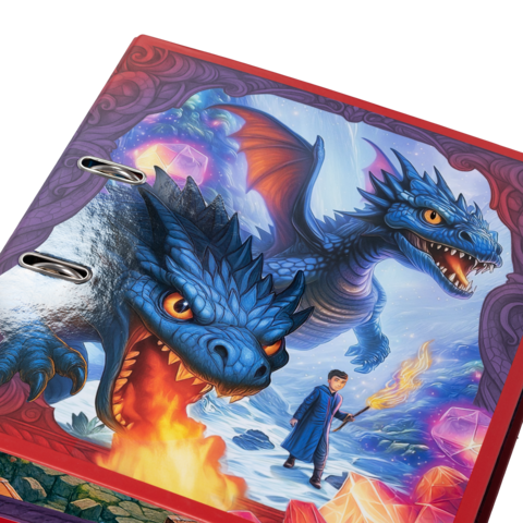 Things are heating up: the magical dragons are coming! The lovingly illustrated design shows these fantastic creatures in action: breathing fire, flying, and traveling with their loyal dragon riders. The perfect motif for imaginative dragon fans. And the coolest thing is: thanks to the finish, it almost looks as if the dragons are jumping out of the file. The file is made of sturdy cardboard and features high-quality workmanship, with inner printing and a sturdy lever arch mechanism. It guarantees optimal storage of documents and transparent sheets for optimal organization at home, at school, at university or in the office. A real eye-catcher on the shelf and on the desk.