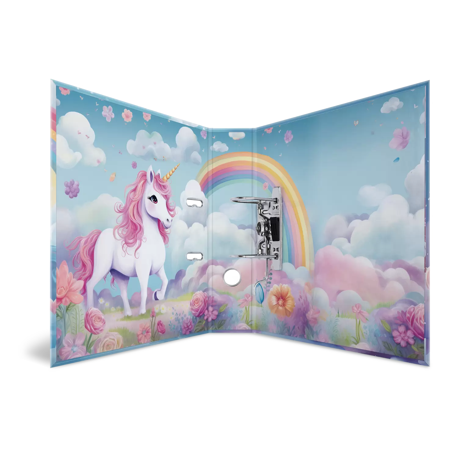 Immerse yourself in a magical world with the Happy Unicorns! This high-quality motif file made of sturdy cardboard with practical arch lever mechanism is the ideal companion for all unicorn fans. The cheerful unicorns with big, bright eyes and soft, light blue fur will make any face smile. The background, decorated with colourful clouds, hearts, flowers and rainbows, adds a touch of magic to children's rooms or school bags. This unicorn file is perfect for little princesses and princes who value style and organisation. A must-have for anyone who wants to keep their school papers or important documents neat and tidy in an imaginative way!