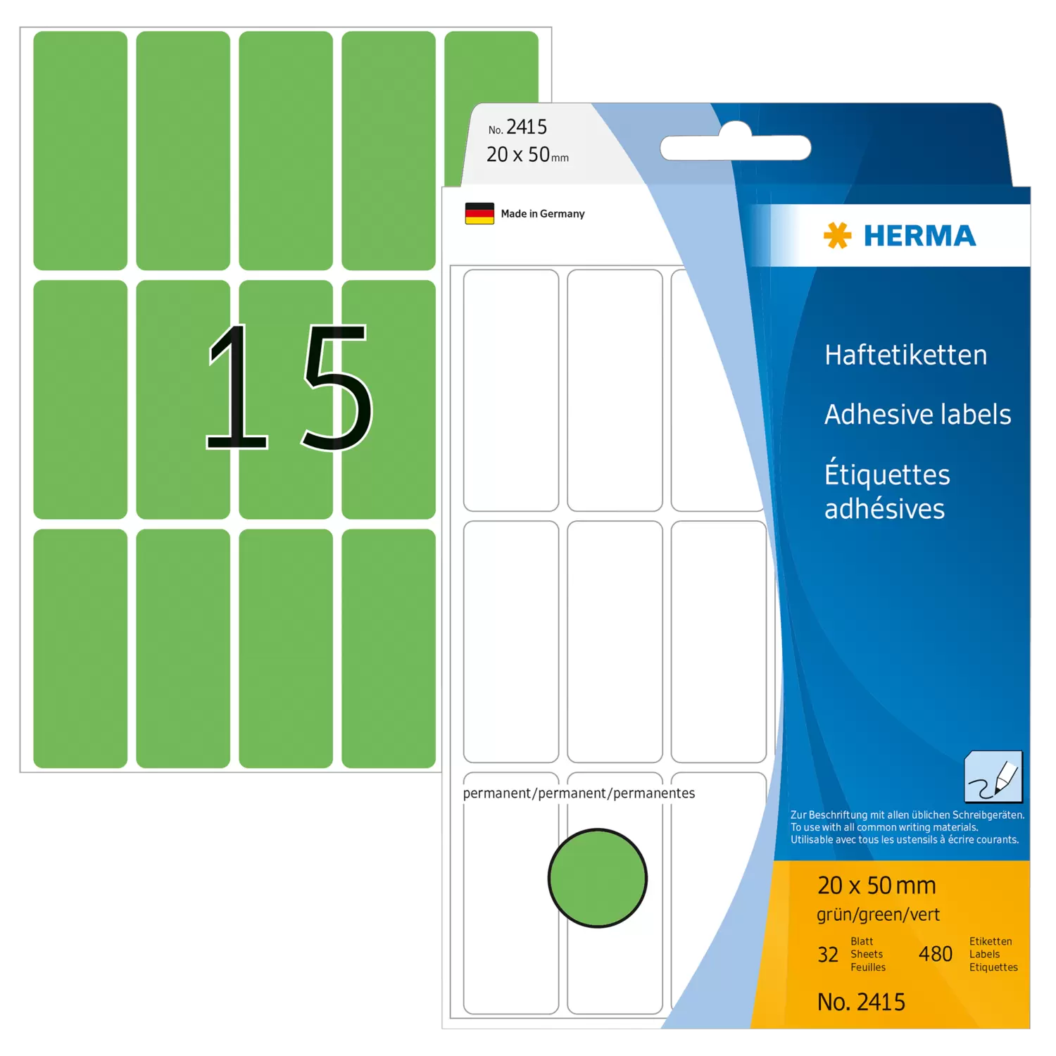 Multi-purpose labels, 20 x 50 mm, green, permanent adhesion, for hand lettering