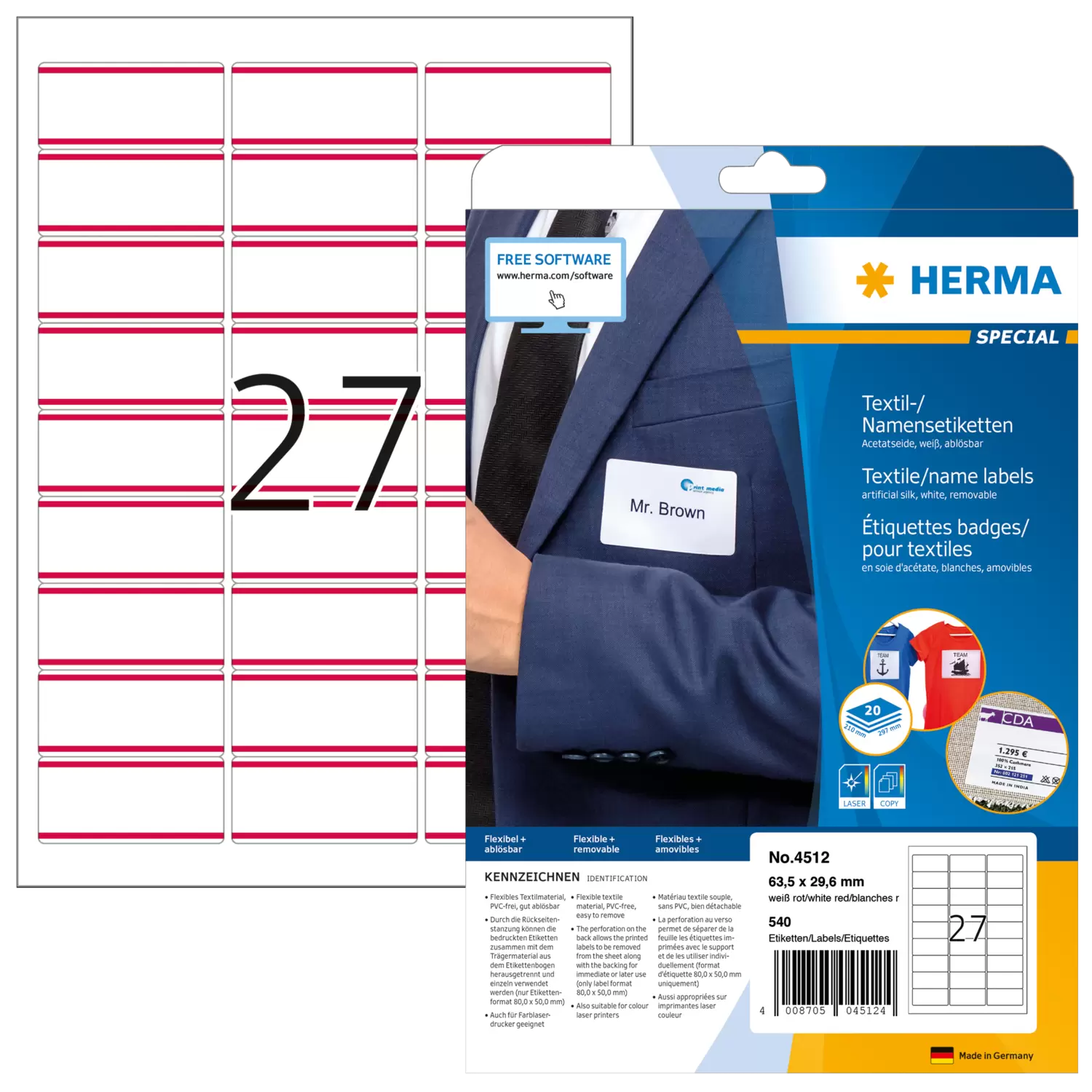 Name/textile labels removable A4, 63,5 x 29,6 mm, white/red stripes made of acetate silk, printable