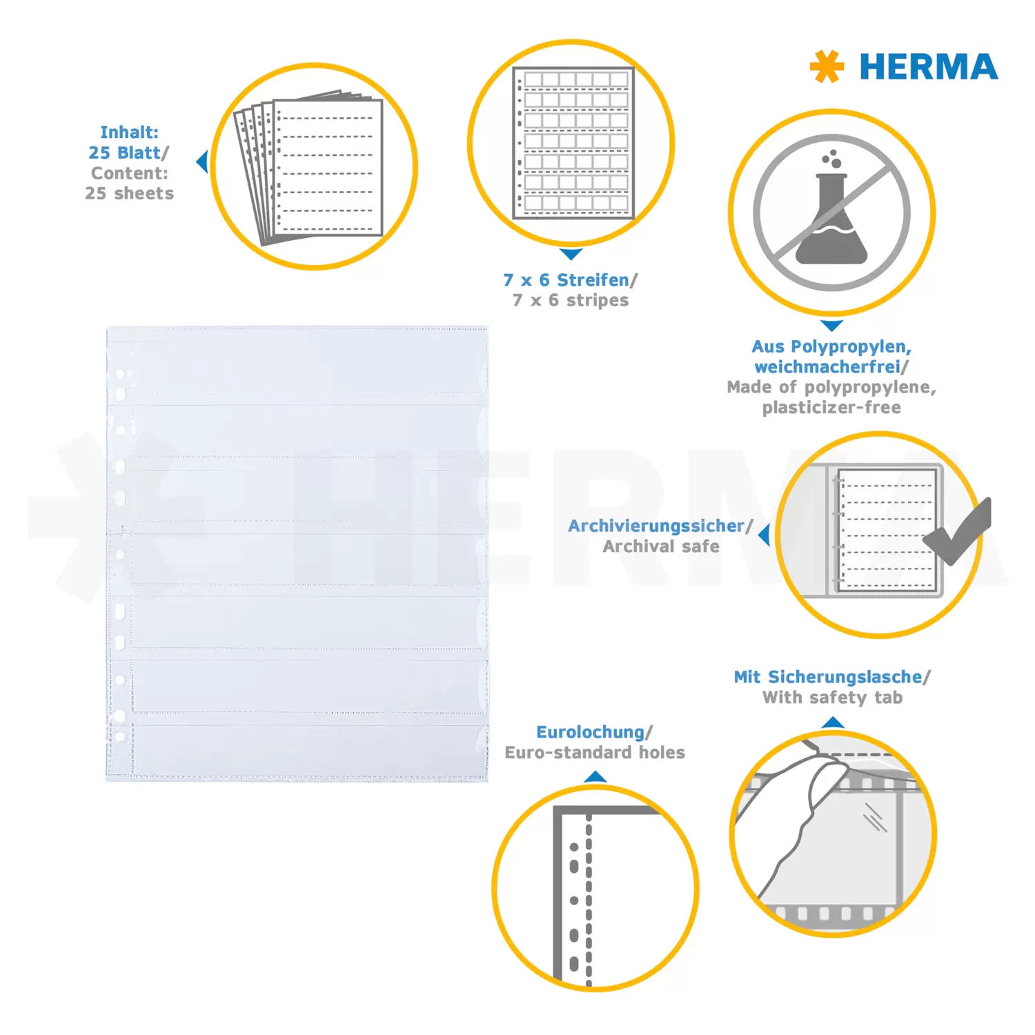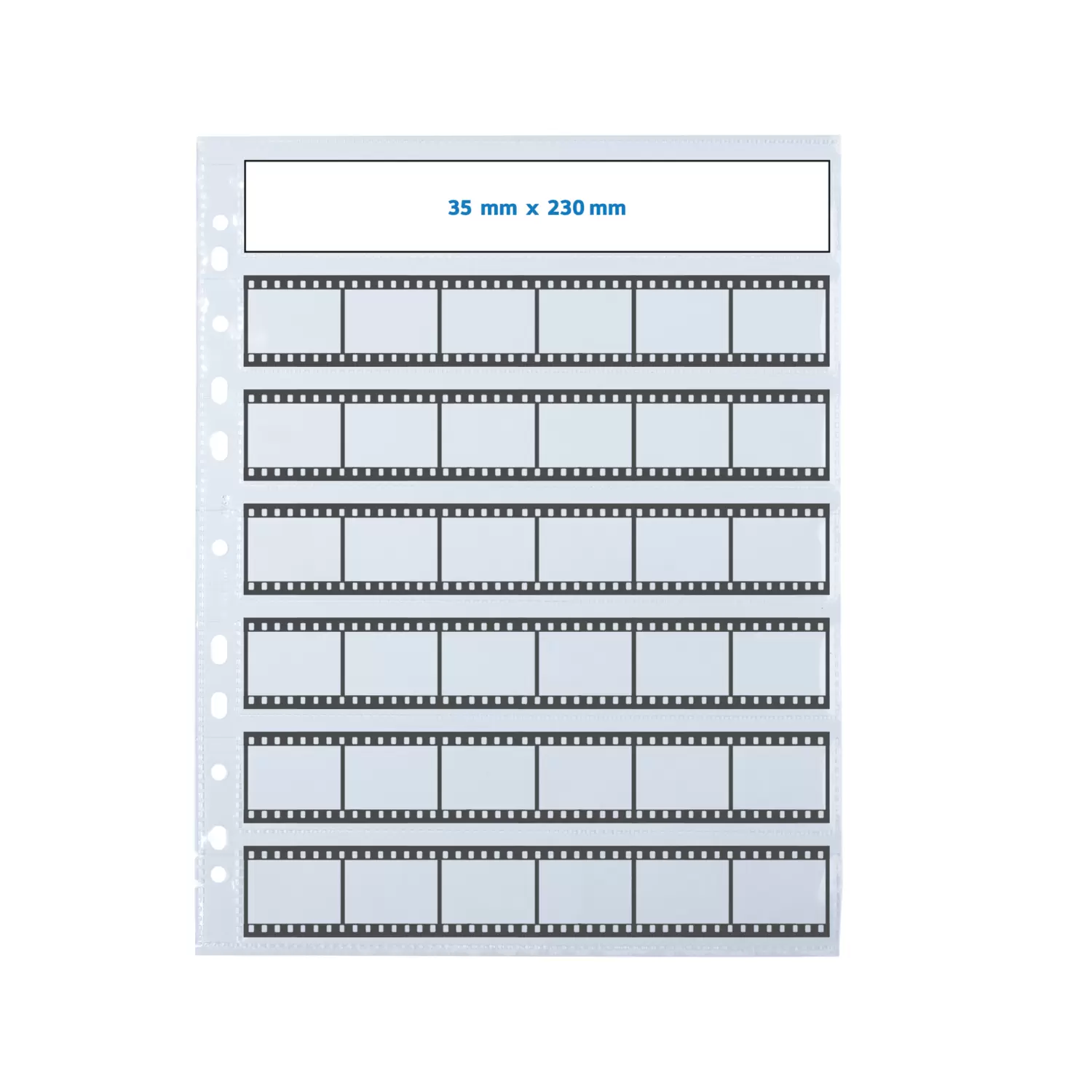 HERMA negative pockets for 35 mm negatives are ideal for neat and tidy storage and archiving of negative stripes. They are made of transparent, robust and plasticizer-free polypropylene and offer space per pocket for 7 stripes of 6 pictures each in 35 mm format. The particular feature are special safety tabs that prevent the negatives from falling out of the pockets. This makes it easy to insert and remove the negatives and yet they are optimally protected. One pocket measures approx. 25.3 x 29.9 cm and can be easily filed in files, ring binders or photobooks thanks to the Euro perforation. For optimal protection, we recommend the 4 ring version. There are 25 pockets in a pack and thus enough space for up to 175 stripes and 1.050 negatives.