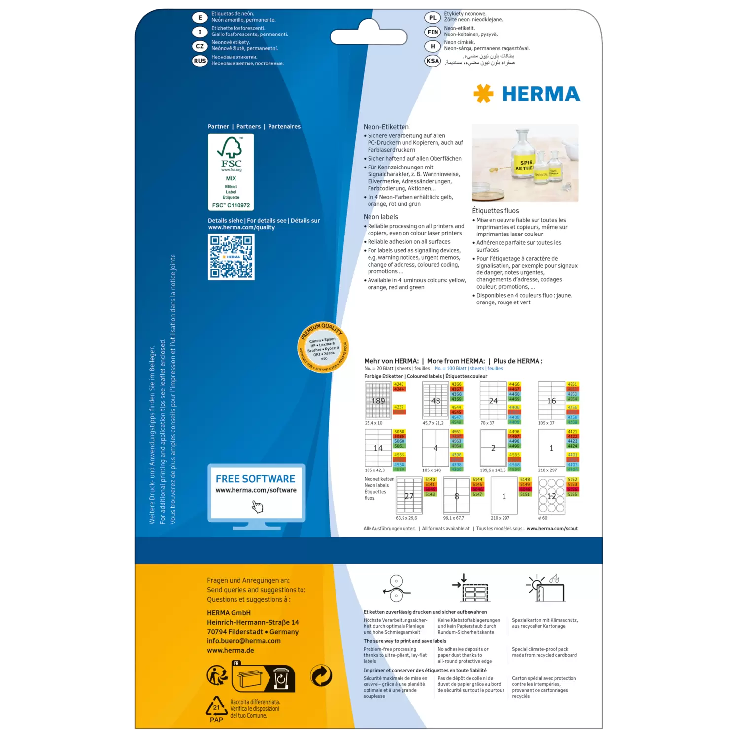 Labels in luminous colours for conveying a strong message, on A4 sheets, self-adhesive. Eye-catching and informative: ideal for labels used as signals, e.g. warning notices, urgent memos, promotions, coloured coding,... In four striking luminous colours, FSC™ Mix Credit certified. For laser printers and inkjet printers, copiers, colour laser printers and colour copiers. Trouble-free processing thanks to all-round protective edge and optimum flatness. Free software solutions: www.herma.com/software.