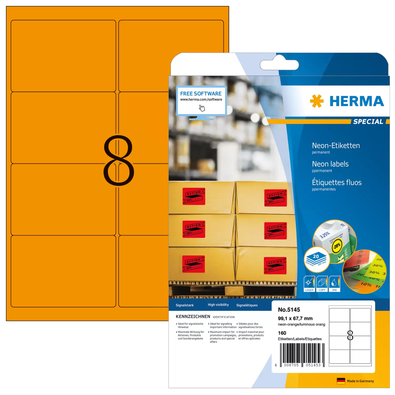 Labels in luminous colours for conveying a strong message, on A4 sheets, self-adhesive. Eye-catching and informative: ideal for labels used as signals, e.g. warning notices, urgent memos, promotions, coloured coding,... In four striking luminous colours, FSC™ Mix Credit certified. For laser printers and inkjet printers, copiers, colour laser printers and colour copiers. Trouble-free processing thanks to all-round protective edge and optimum flatness. Free software solutions: www.herma.com/software.