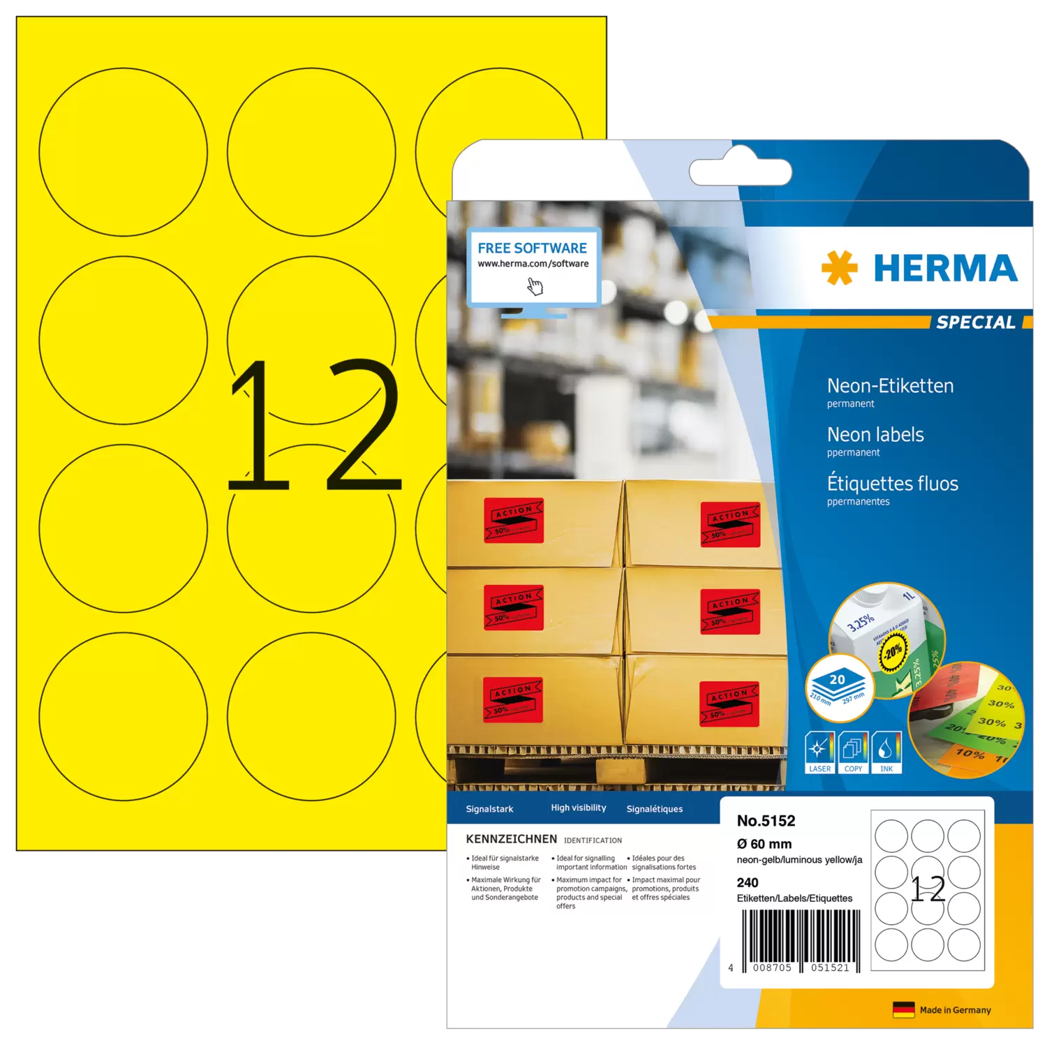 Neon labels A4, Ø 60 mm, round luminous yellow permanent adhesion