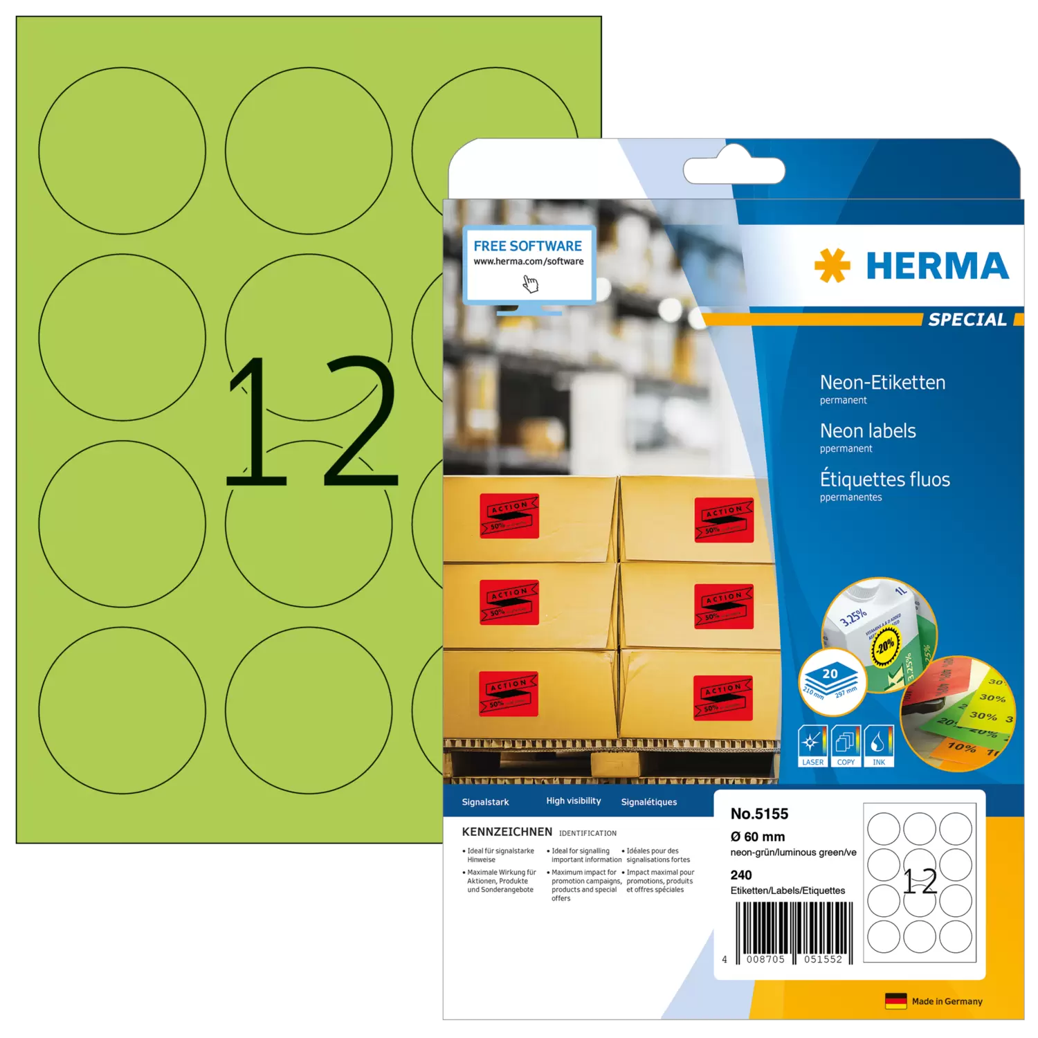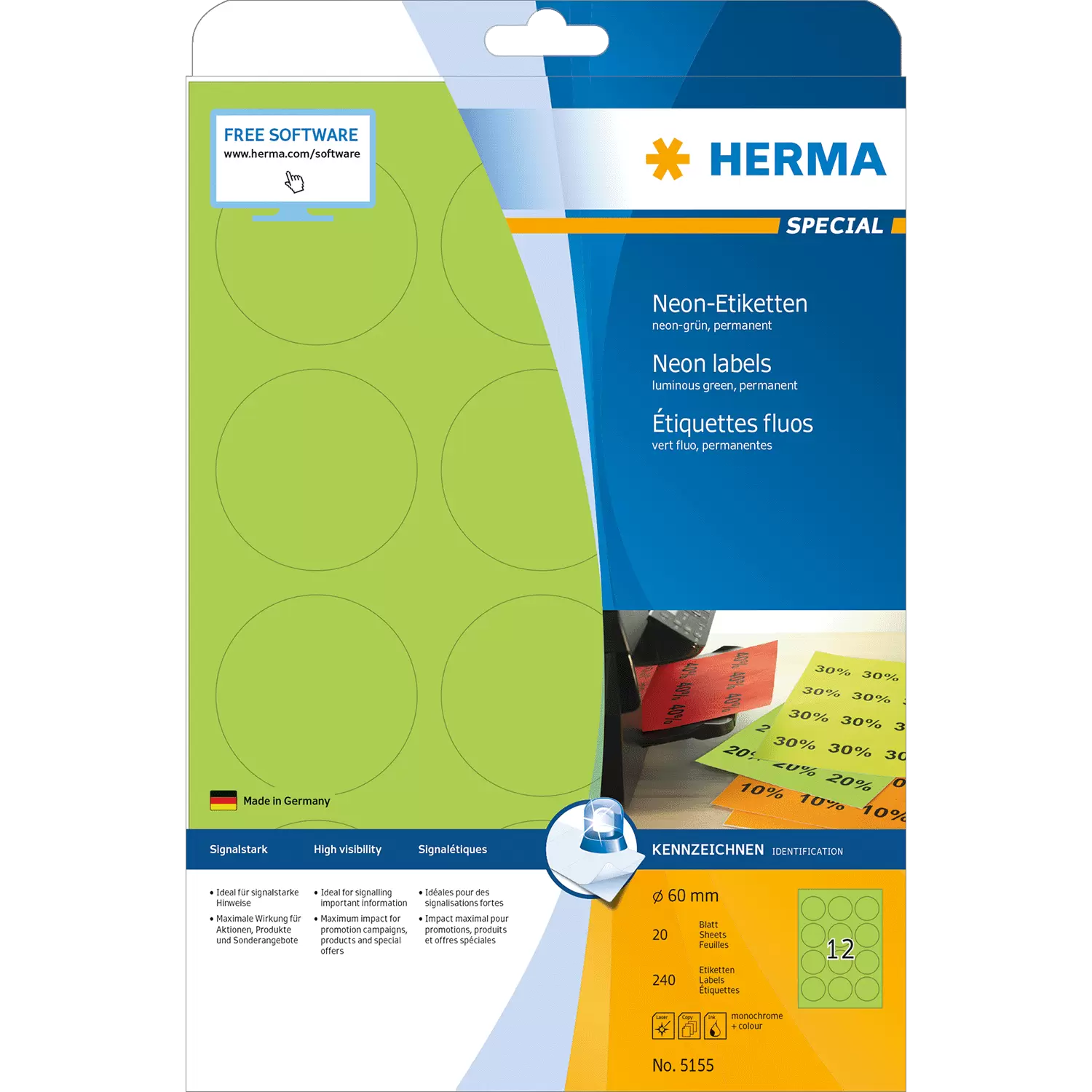 Labels in luminous colours for conveying a strong message, on A4 sheets, self-adhesive. Eye-catching and informative: ideal for labels used as signals, e.g. warning notices, urgent memos, promotions, coloured coding,... In four striking luminous colours, FSC™ Mix Credit certified. For laser printers and inkjet printers, copiers, colour laser printers and colour copiers. Trouble-free processing thanks to all-round protective edge and optimum flatness. Free software solutions: www.herma.com/software.