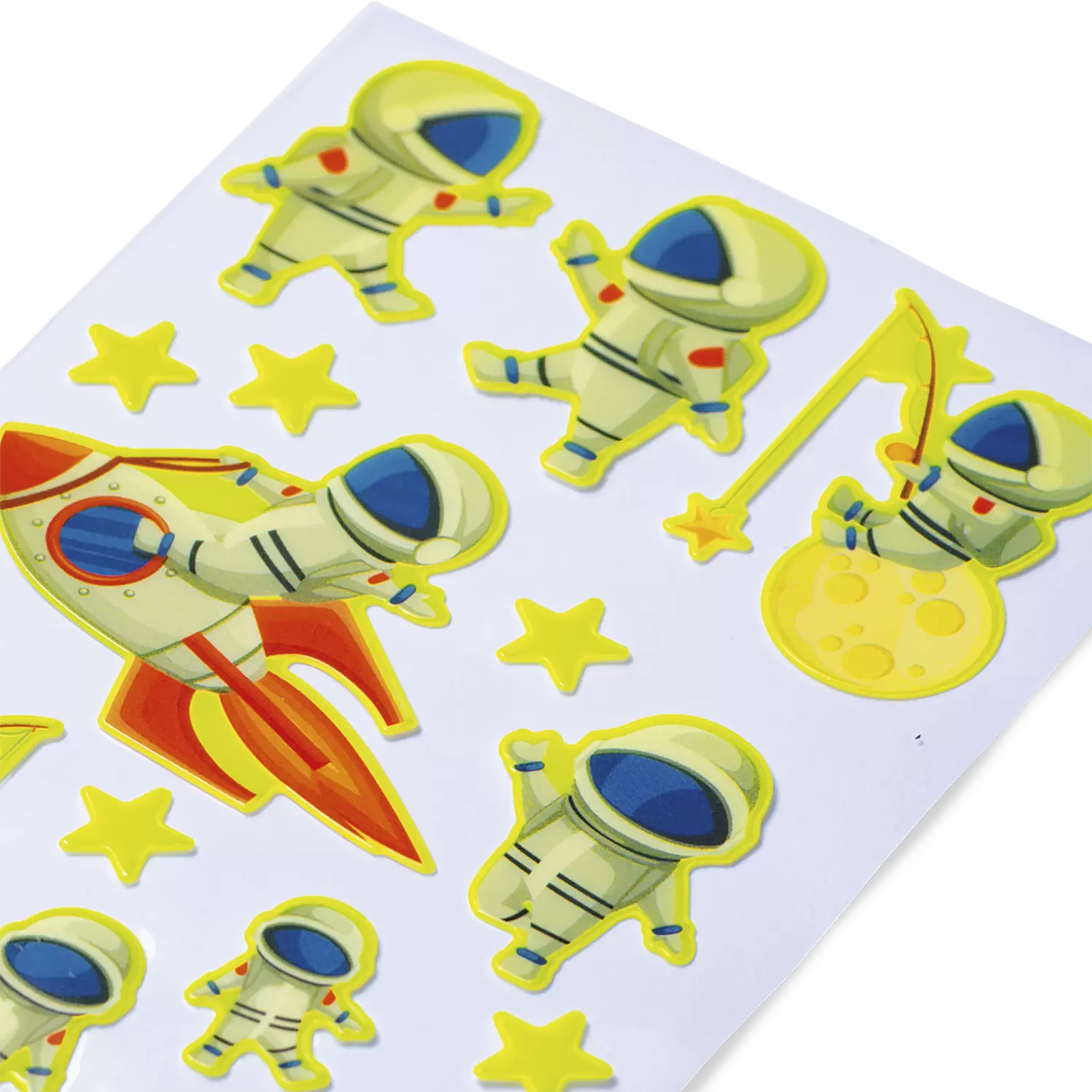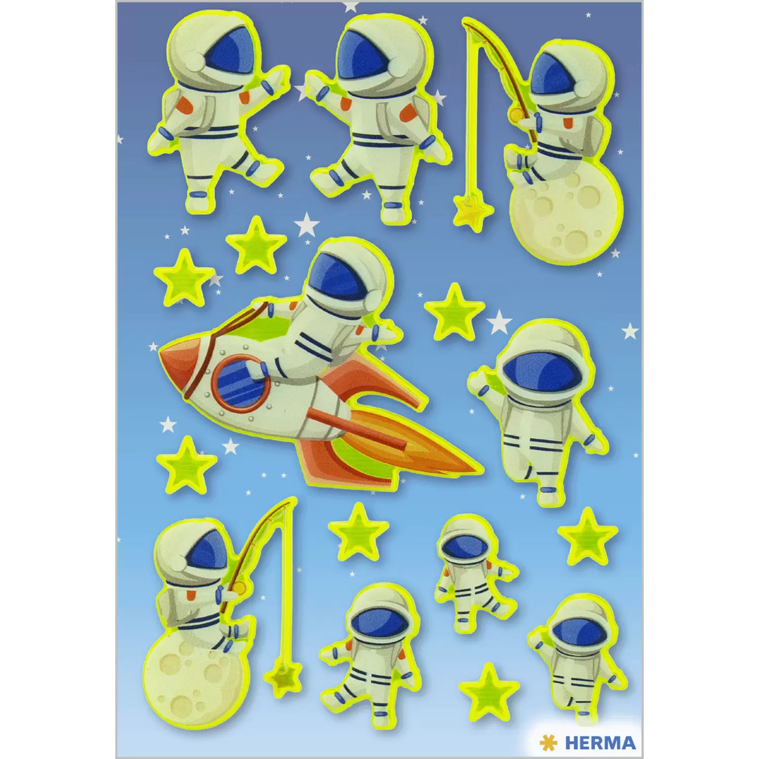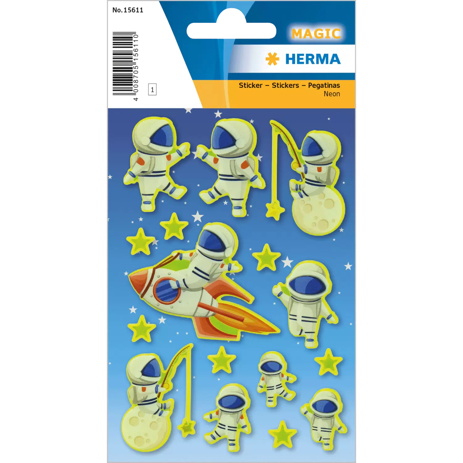child-friendly HERMA neon stickers for little astronaut fans, 16 stickers on one sheet, can be easily peeled off and stuck on, great sticker fun for collecting, swapping and decorating, ideal for decora ting friendship books, letters, school folders and photo albums, for a wide variety of design ideas, stickers are made of plastic, radiant and eye-catching neon effect
