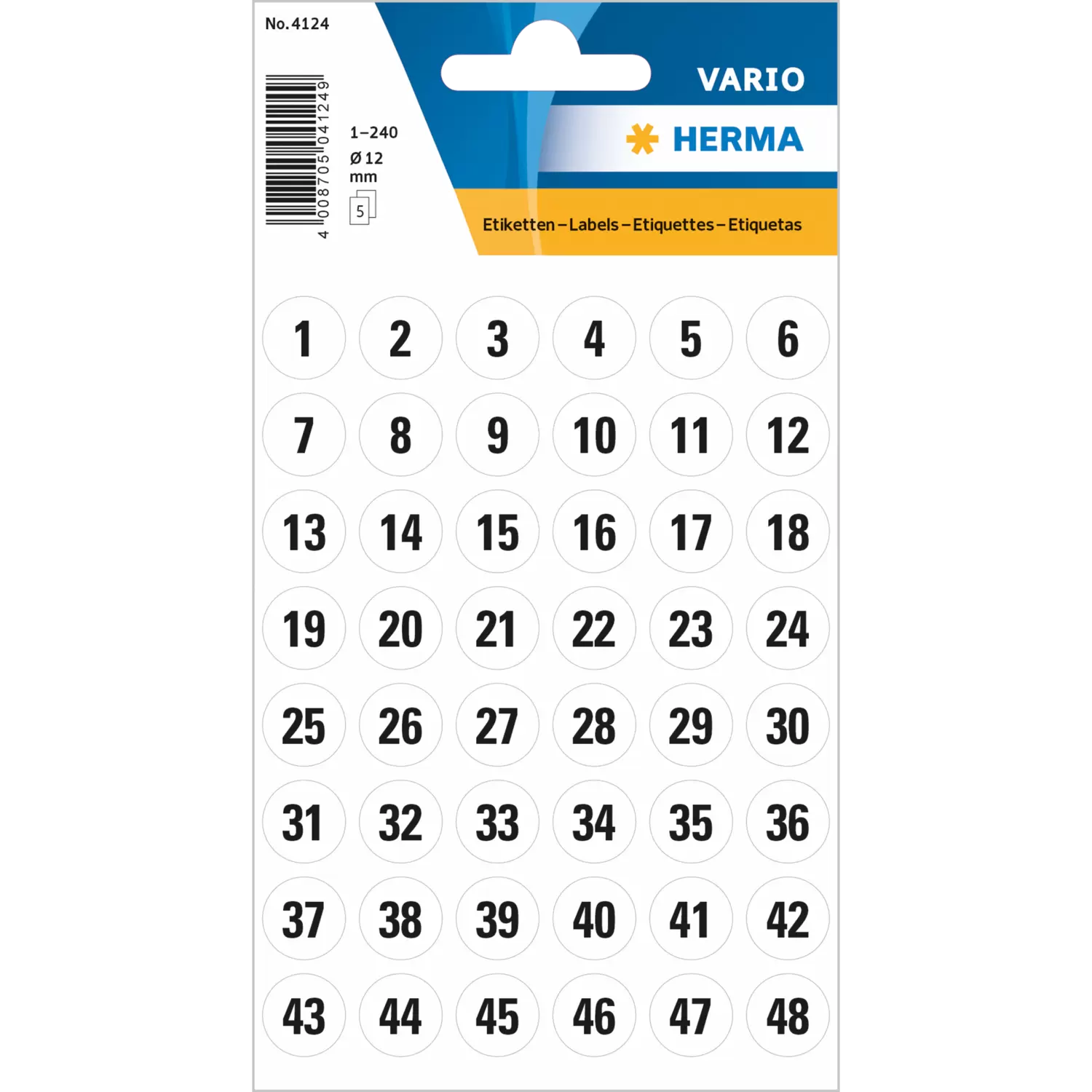 Numbers Ø 12 mm 1-240 paper white black 5 sheets