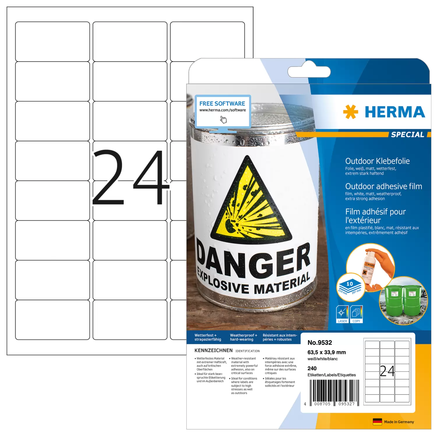 Weatherproof outdoor film labels A4, 63,5 x 33,9 mm, white, extremely strong adhesion, stretchable