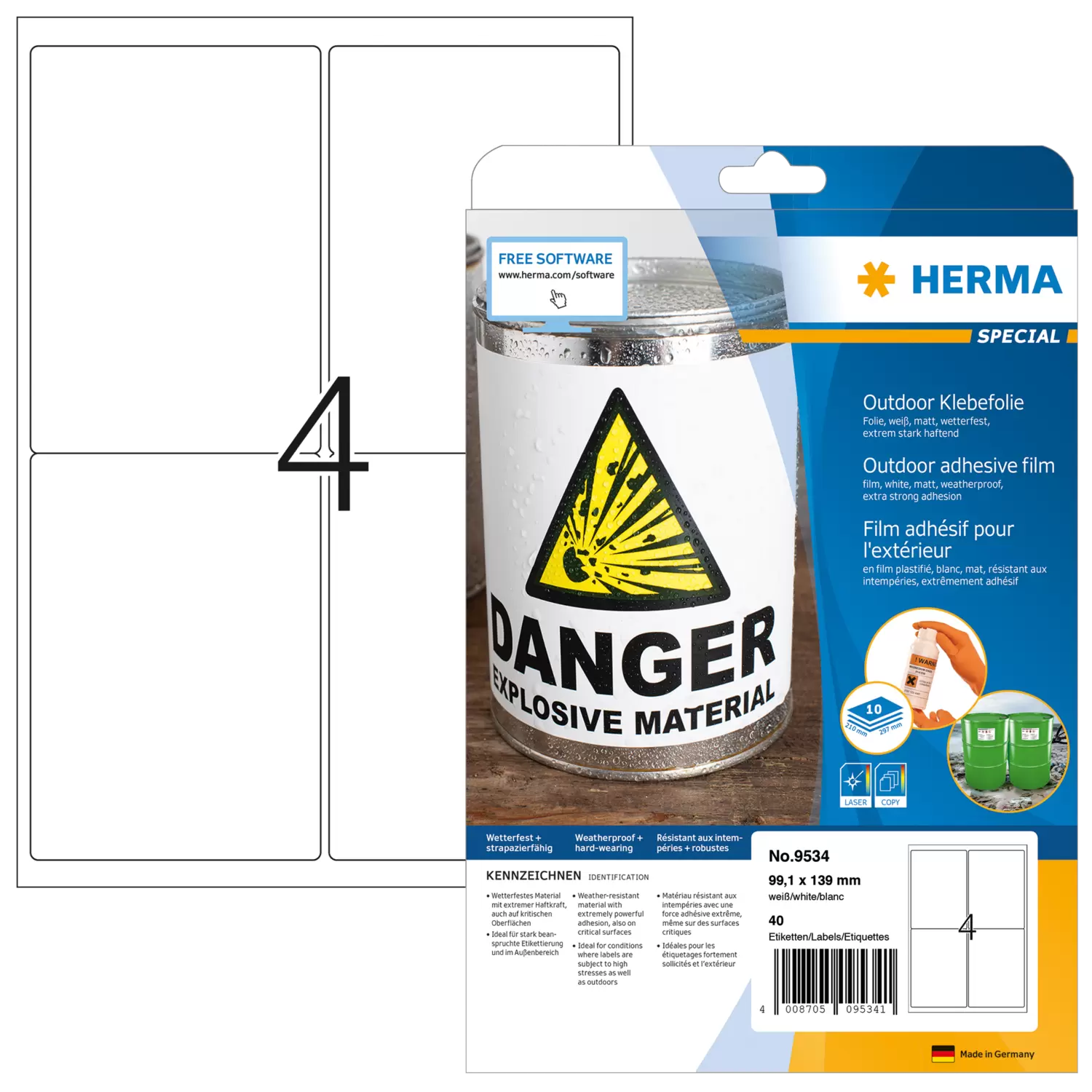 Weatherproof outdoor film labels A4, 99,1 x 139 mm, white, extremely strong adhesion, stretchable