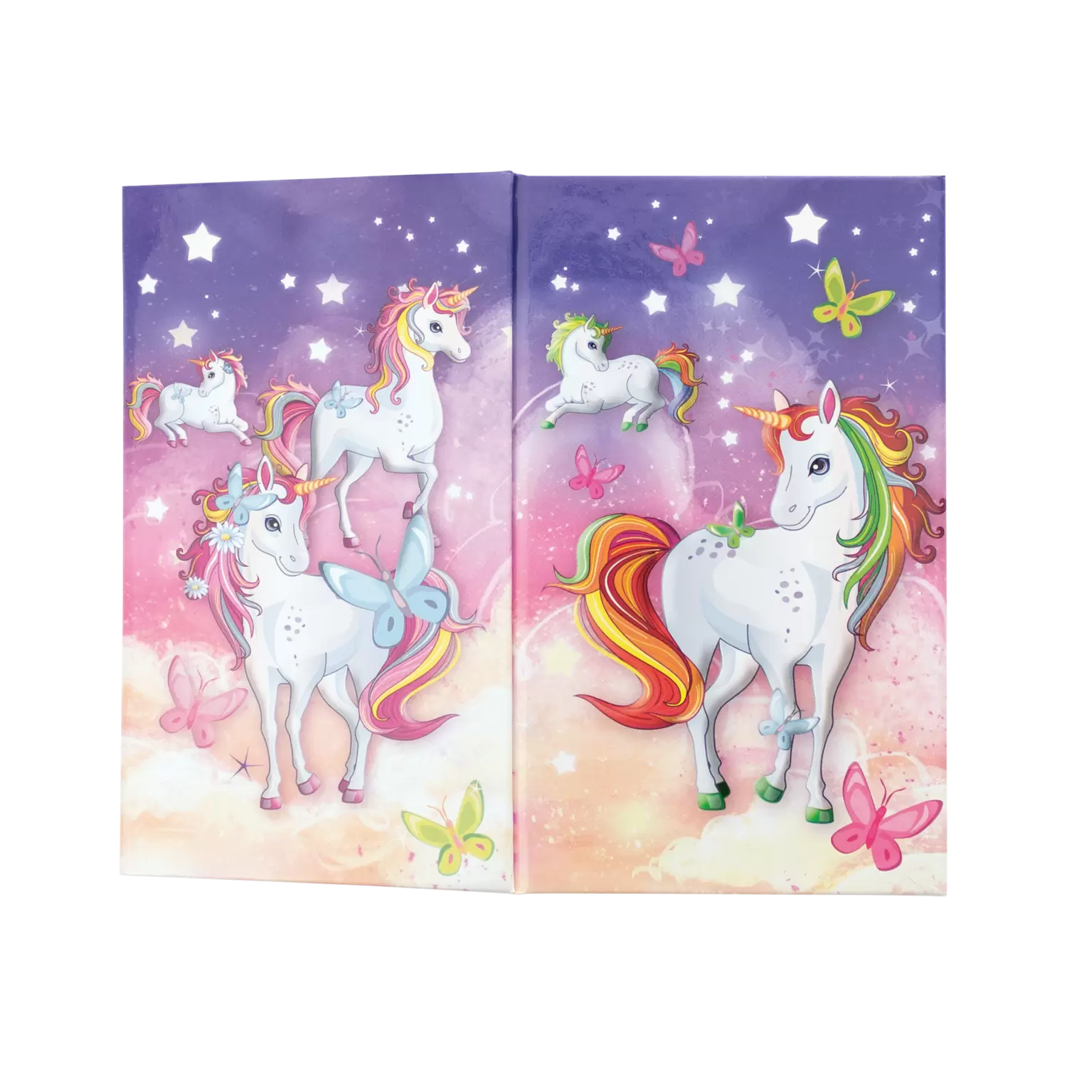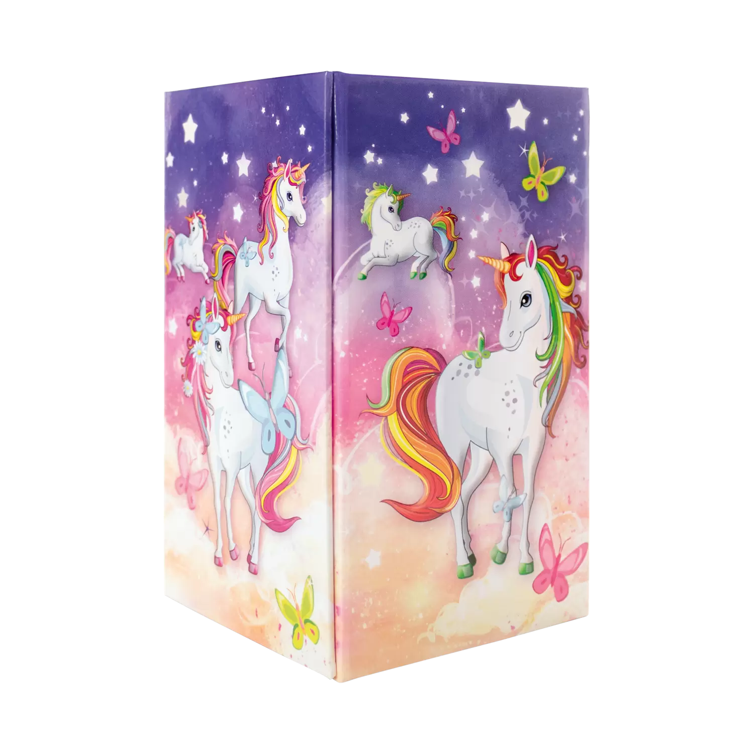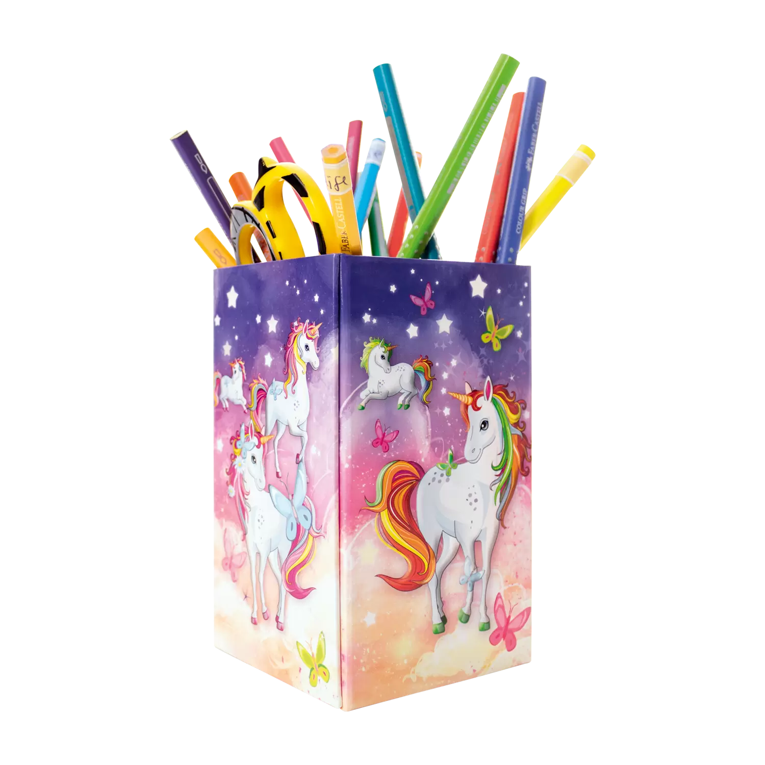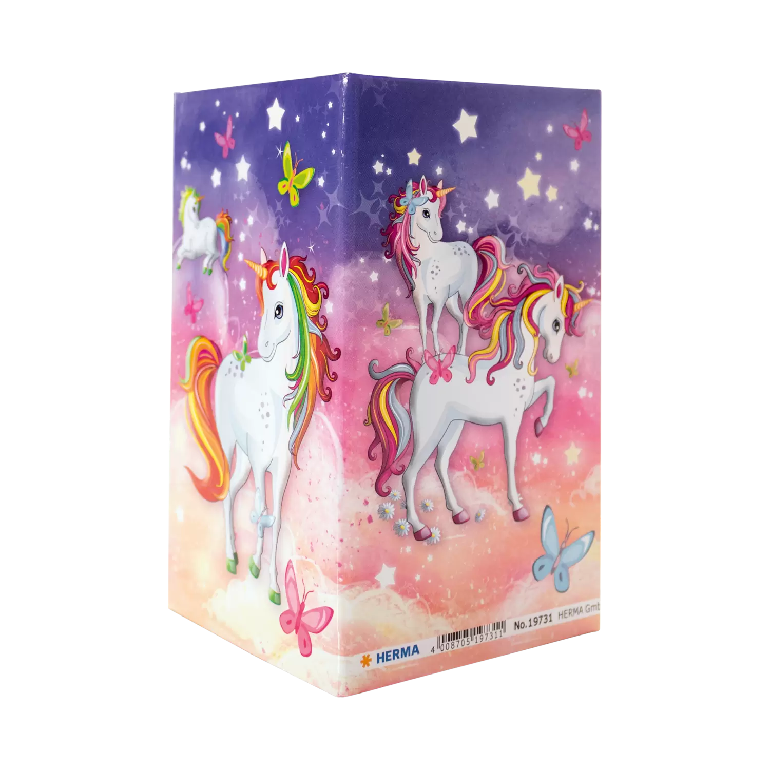 Unicorns are simply magical - the mythical creatures inspire girls and boys. This beautifully designed pen holder in delicate shades of purple and pink is a hit with all unicorn fans! Practical and beautiful to look at, a real eye-catcher on the children's desk. The pen holder is made of sturdy cardboard. Pens, brushes, rulers, scissors and much more fit in perfectly. The coated surface makes it wipeable and easy to clean. Keeping things tidy is easy, even in the children's room. With HERMA. Discover the products of the popular unicorn series: folders, motif files, desk pads, stickers and more! Lovingly designed, popular with boys and girls - a highlight in the children's room.