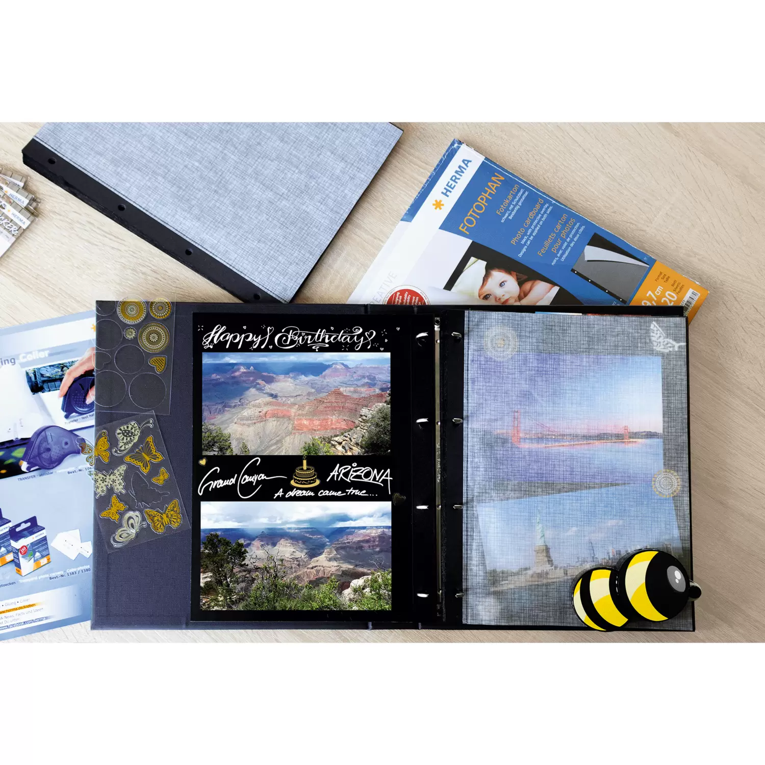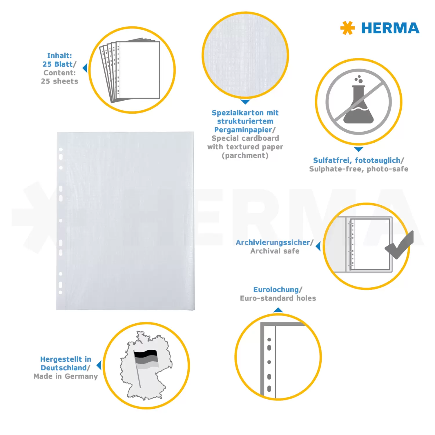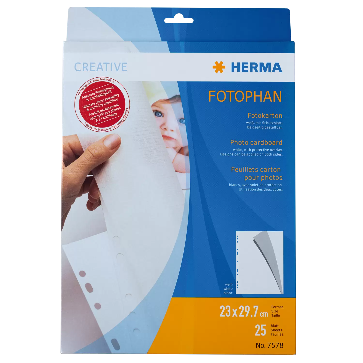 HERMA photo cardboard in the format 23 x 29.7 cm is ideal for keeping photos, pictures, postcards, newspaper articles and much more safe and attractive for a long time. The special cardboard is very sturdy so that the pages do not crease or wrinkle, and the affixed glassine paper, a semi-transparent protective sheet, is sulphate-free and provides additional protection for the photos. In this way, the photo cardboards can be used on both sides. With practical Euro perforation, they can be filed in all standard photo books and photo albums, files and ring binders. Each package contains 25 sheets, white. HERMA glue dispensers, photo glue and photo corners are ideal for mounting.