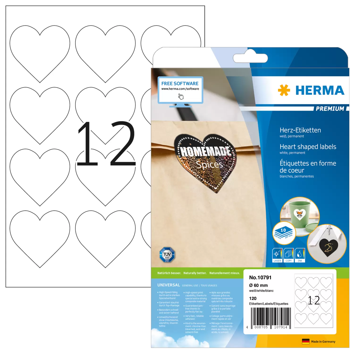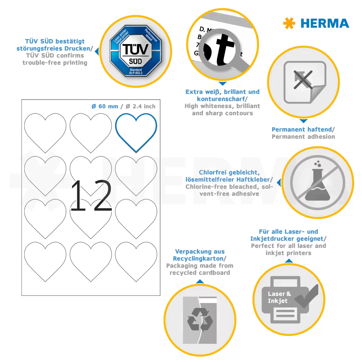 PREMIUM heart shaped labels A4, Ø 60 mm, white, permanent adhesion