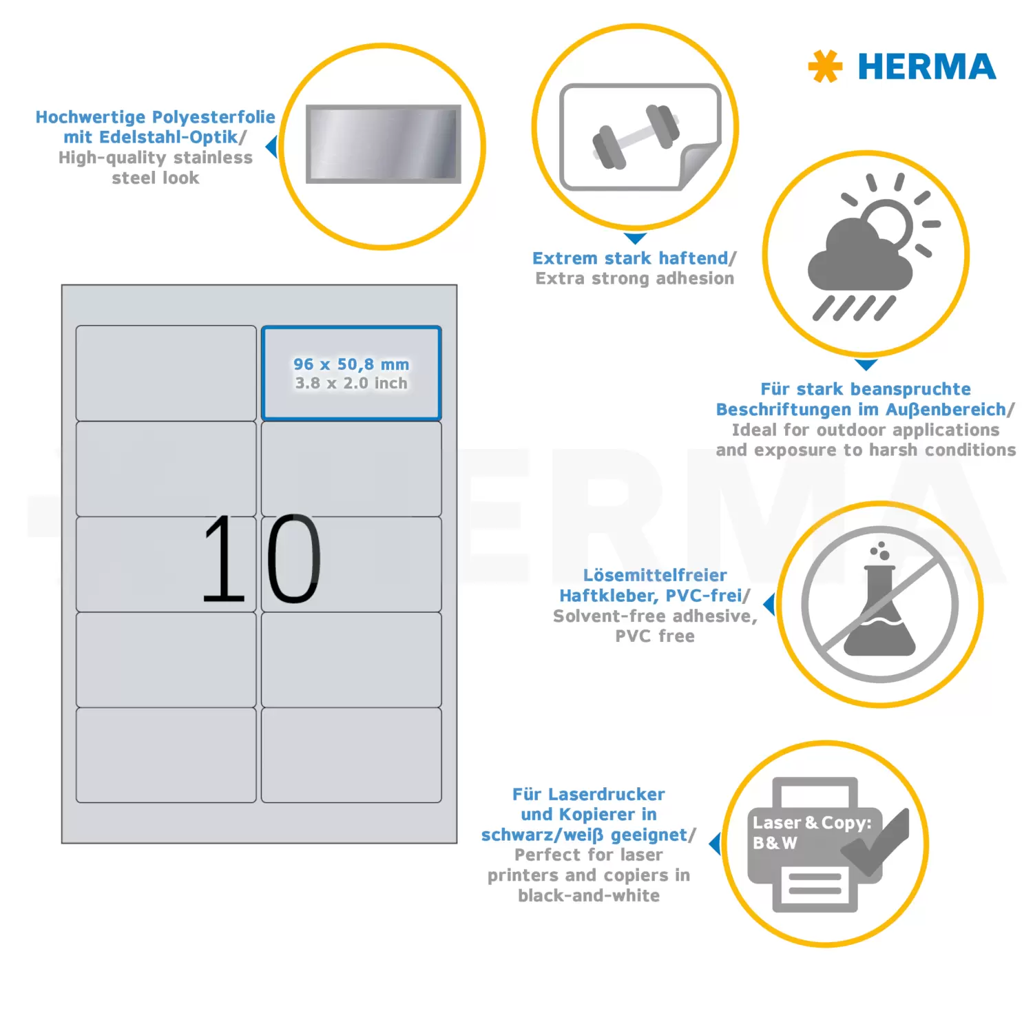 Silver labels made of matte polyester film, on A4 sheets, self-adhesive. Ideal for permanent labelling of components, rating plates and objects in inventories. High-quality stainless steel look. Resistant to weather and ageing, oil and dirt-repellent, tear-resistant, wet-wipeable, resistant to temperatures between -40°C and +150°C. Powerful adhesion, even on rough or critical surfaces. Trouble-free processing thanks to all-round protective edge and optimum flatness. For laser printers and copiers. Not suitable for inkjet printers, colour laser printers or colour copiers. Free software solutions: www.herma.com/software.