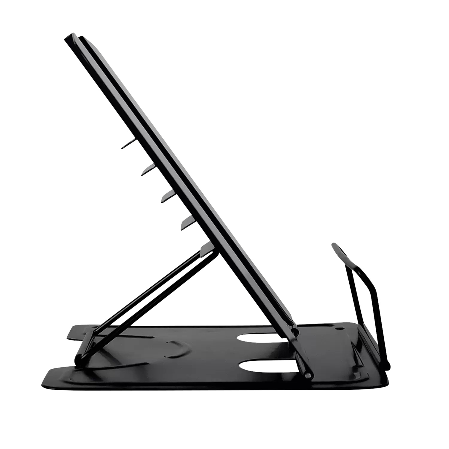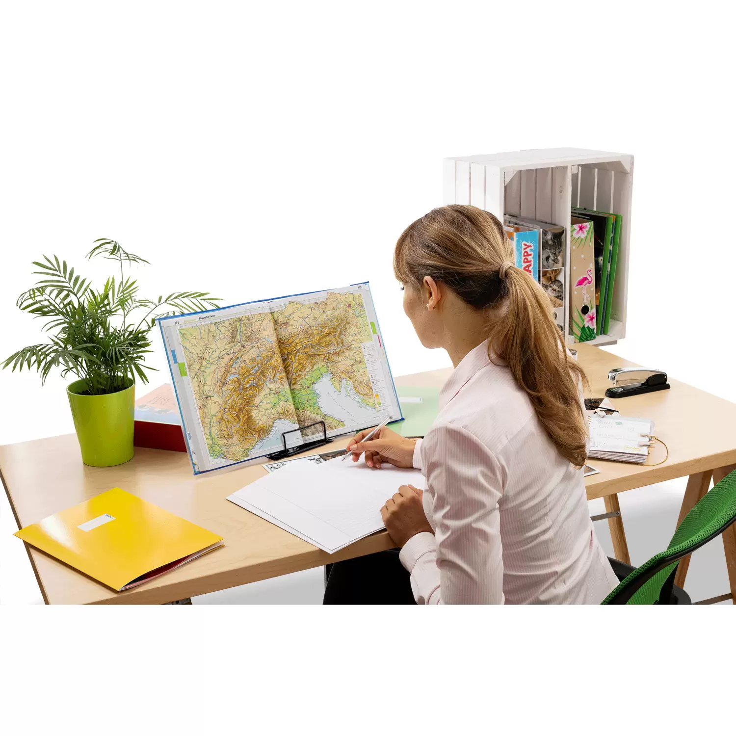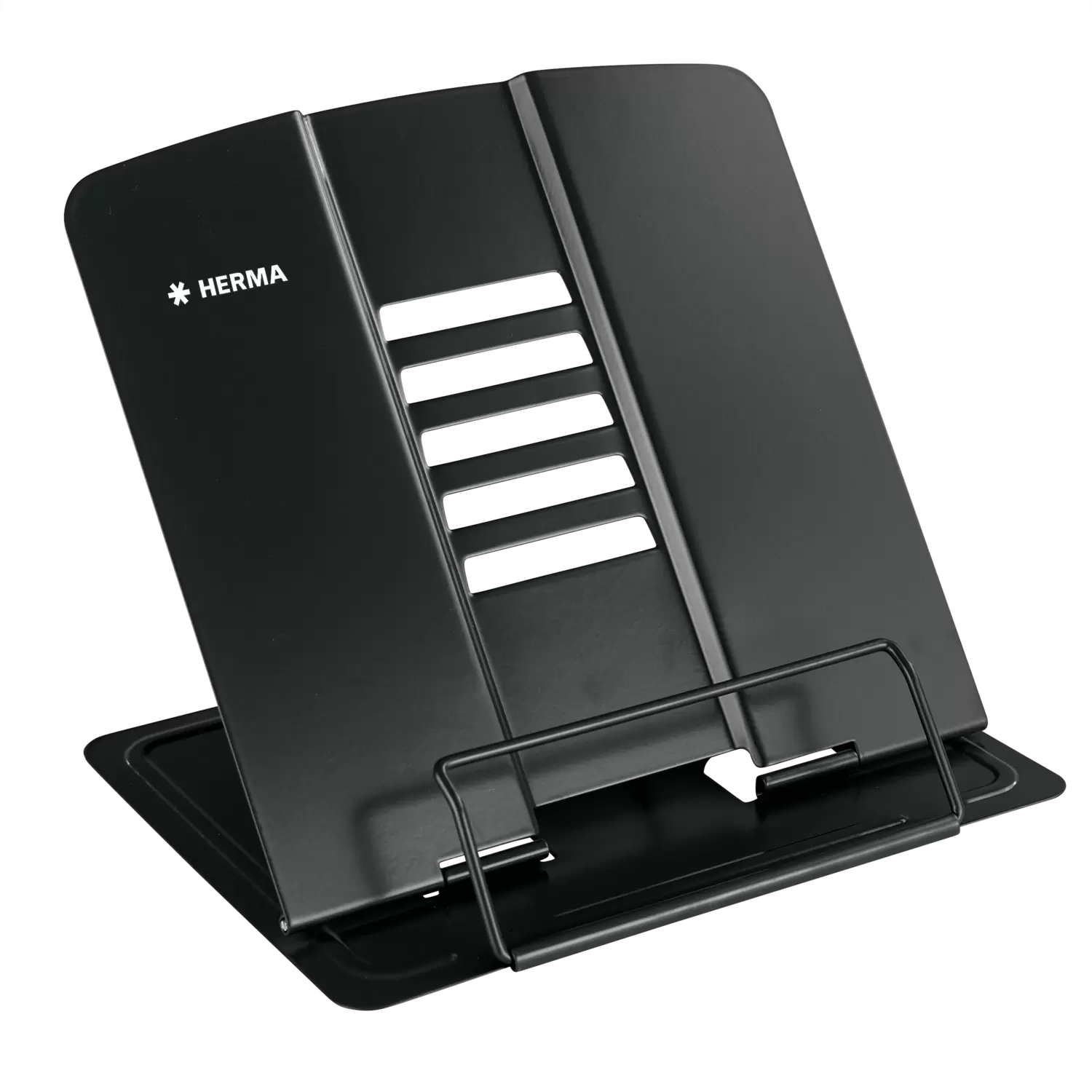 Reading stand, bookend, book and cookbook holder, tablet computer holder: there are many names for HERMA's unique and multifunctional reading rack. The reading rack is black, made of lacquered metal and has a height of 19 cm when opened, a width of 19.8 cm and a depth of 15.7 cm. It is therefore also ideal for heavy books, atlases and computer tablets. Its tilt angle can be adjusted to 5 different positions, making it comfortable for the neck to look at a book or tablet computer whether it's standing on the desk, on campus or in the kitchen. For a firm and optimal stand, it is equipped with slip-resistant knobs on the bottom. If it is not needed or has to be transported, it can be easily folded and stowed away. The multifunctional book stand is also available in the colors blue, white, pink and red. Perfect, for example, to give books, tablet computers, magazines, exercise books, music sheets and cookbooks, in different sizes, the perfect stand and hold. Flexible to use in the office or home office, when travelling, at school, on campus, in kindergarten, in the kitchen or at outdoor barbecues and at home on the sofa.