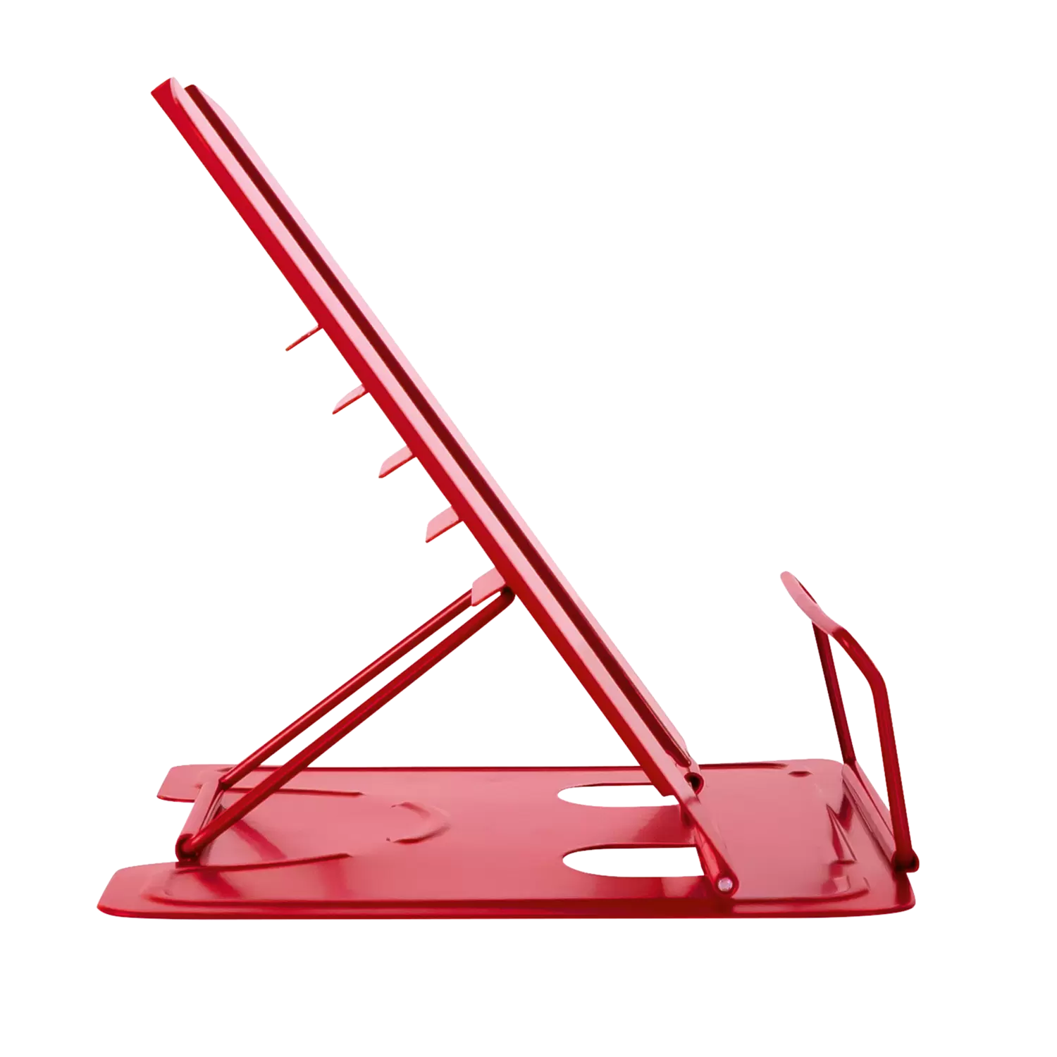 Reading stand, bookend, book and cookbook holder, tablet computer holder: there are many names for HERMA's unique and multifunctional reading rack. The reading rack is red, made of lacquered metal and has a height of 19 cm when opened, a width of 19.8 cm and a depth of 15.7 cm. It is therefore also ideal for heavy books, atlases and computer tablets. Its tilt angle can be adjusted to 5 different positions, making it comfortable for the neck to look at a book or tablet computer whether it's standing on the desk, on campus or in the kitchen. For a firm and optimal stand, it is equipped with slip-resistant knobs on the bottom. If it is not needed or has to be transported, it can be easily folded and stowed away. The multifunctional book stand is also available in the colors blue, white, pink and black. Perfect, for example, to give books, tablet computers, magazines, exercise books, music sheets and cookbooks, in different sizes, the perfect stand and hold. Flexible to use in the office or home office, when travelling, at school, on campus, in kindergarten, in the kitchen or at outdoor barbecues and at home on the sofa.