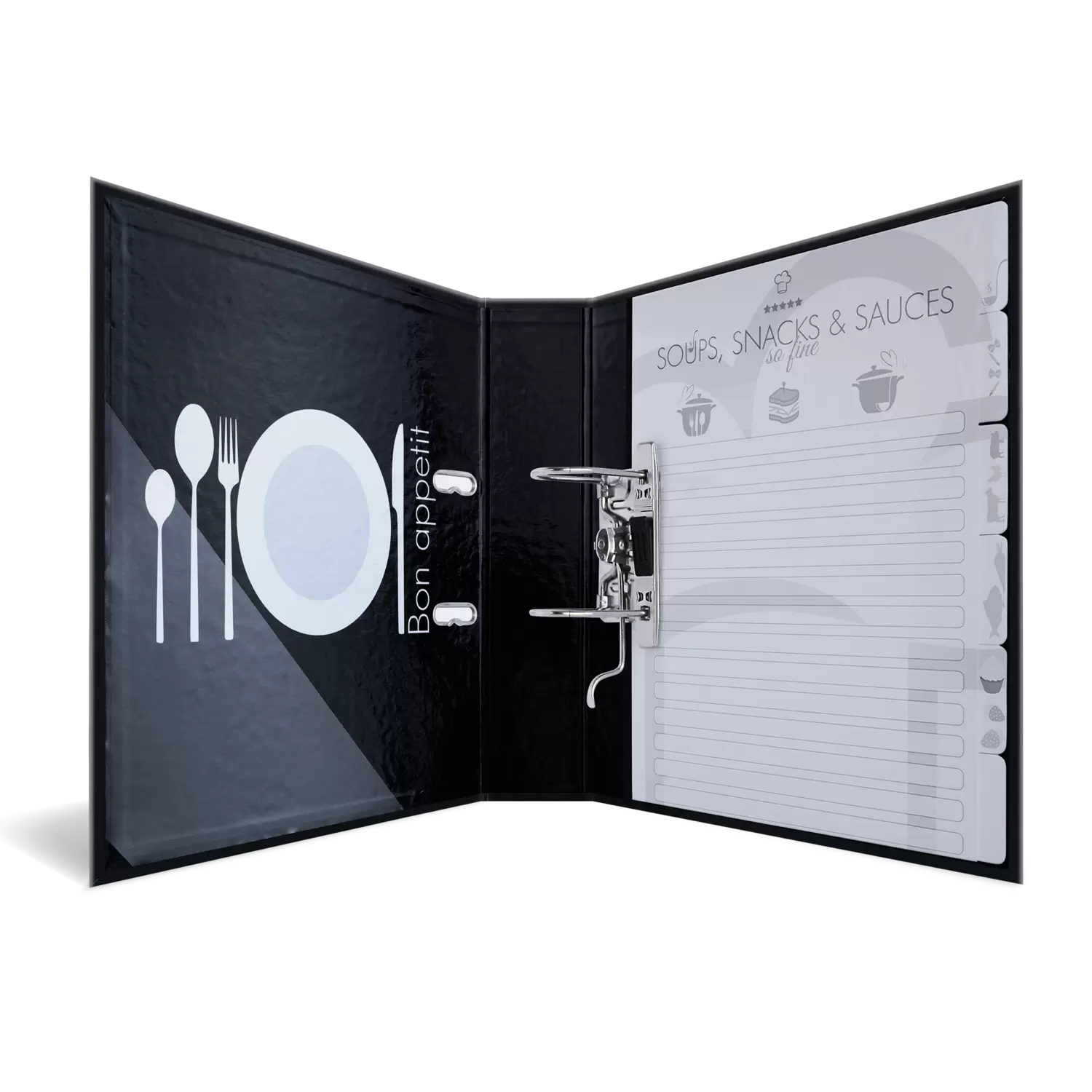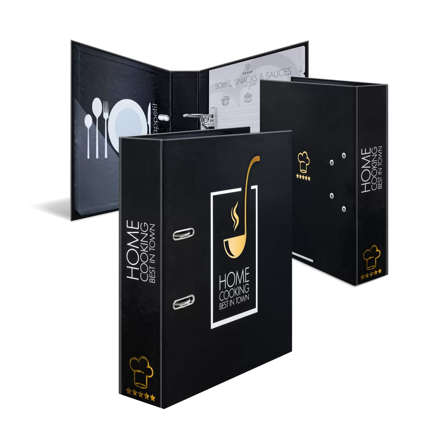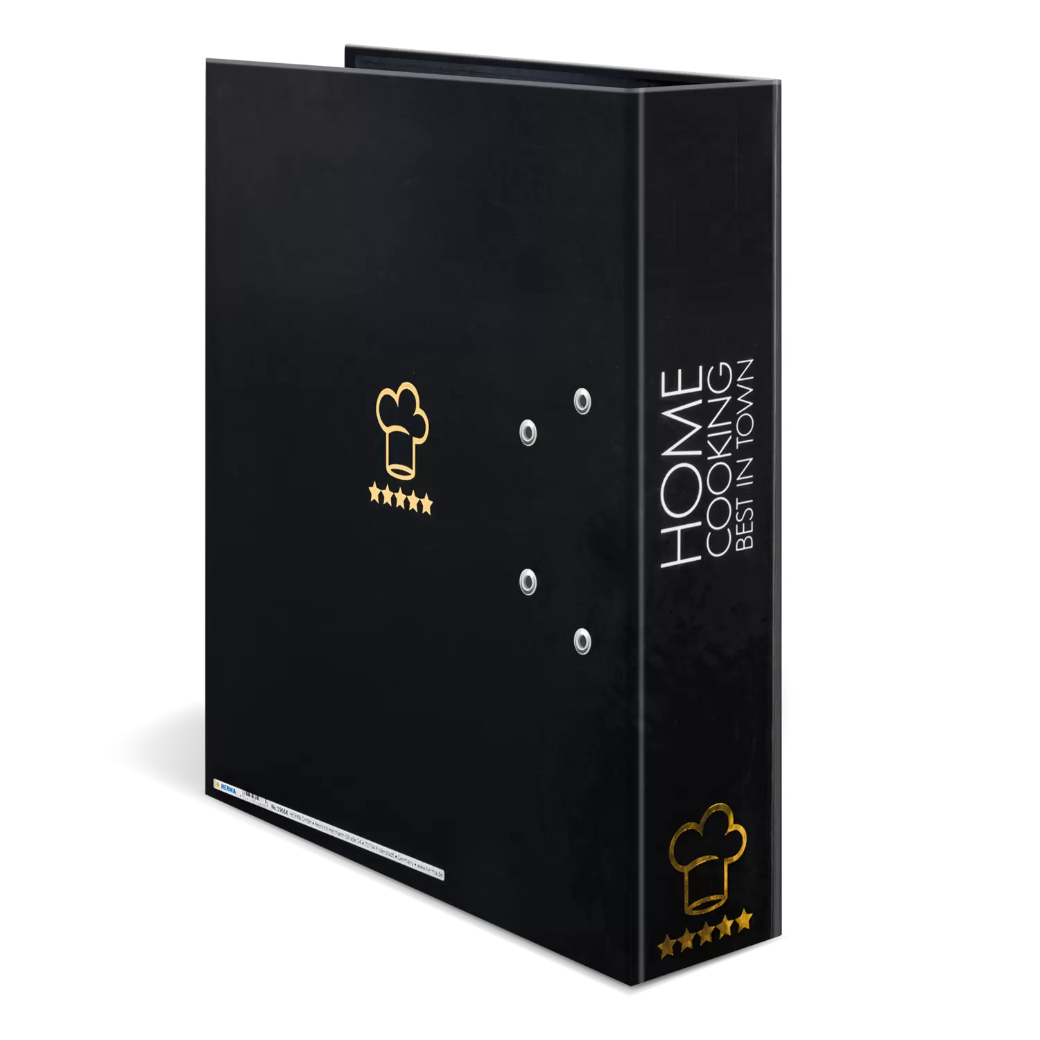 The HERMA "Homecooking" motif file in A4 format offers plenty of space for your finest cooking and baking recipes and is suitable for all transparent pockets with standard perforations. This keeps recipes well protected from splashes and fingerprints. With the practical 6-part index, recipes, ideas, tips and tricks c+BK7an be easily classified and found again. The index is divided into "Soups, Snacks & Sauces", "Pasta & Co.", "Meat", "Veggies <(>&<)> Seafood", "Dessert" and a free page for writing by yourself. Ideal for all those who like to cook, try out new things in the kitchen or just want to experiment. The decorative file in a chic black design is made of sturdy cardboard, with a high-quality lever arch mechanism, compressor bar and is finished with gold foil - an eye-catcher on the kitchen shelf. Especially clever: the stick-on pocket inside for important notes and more.