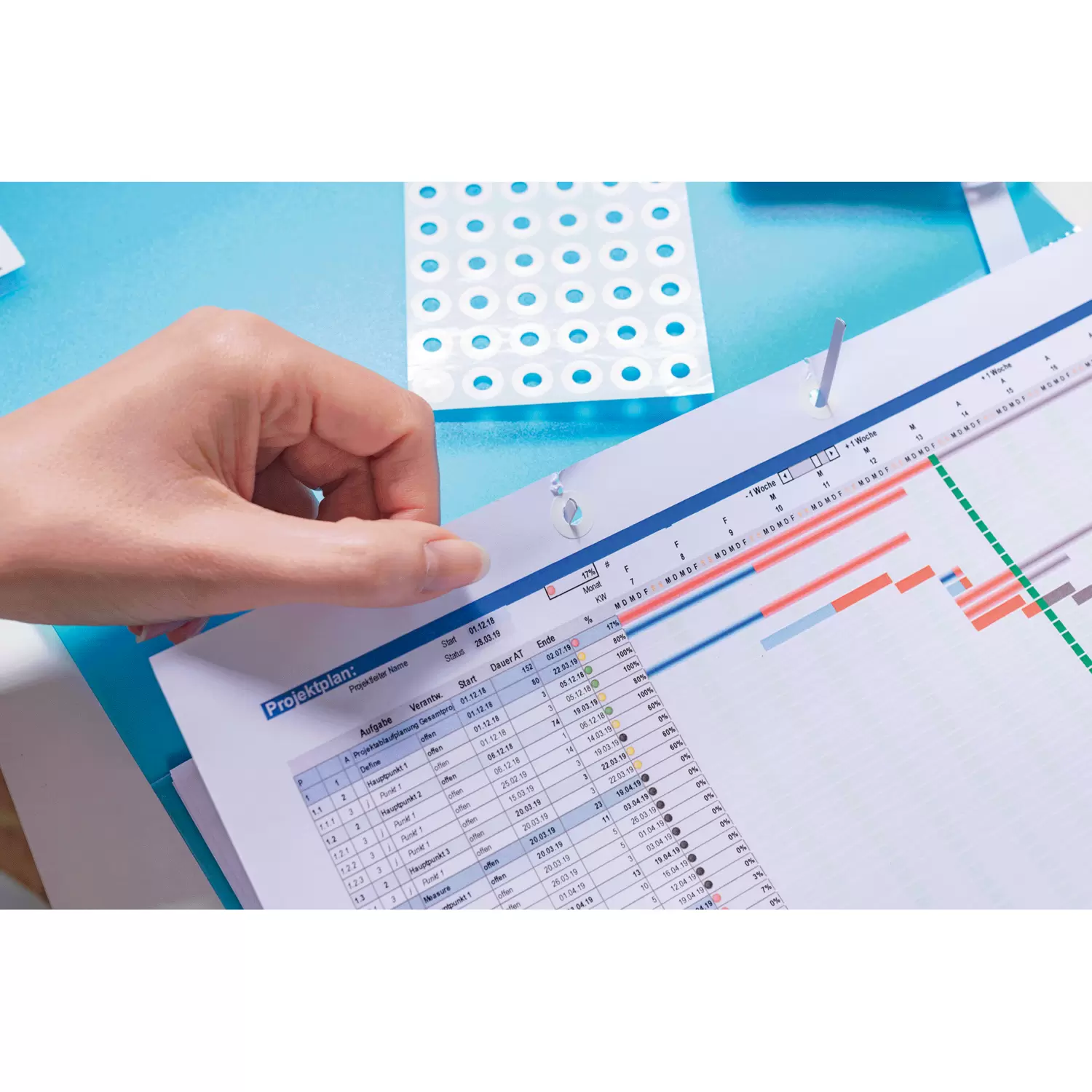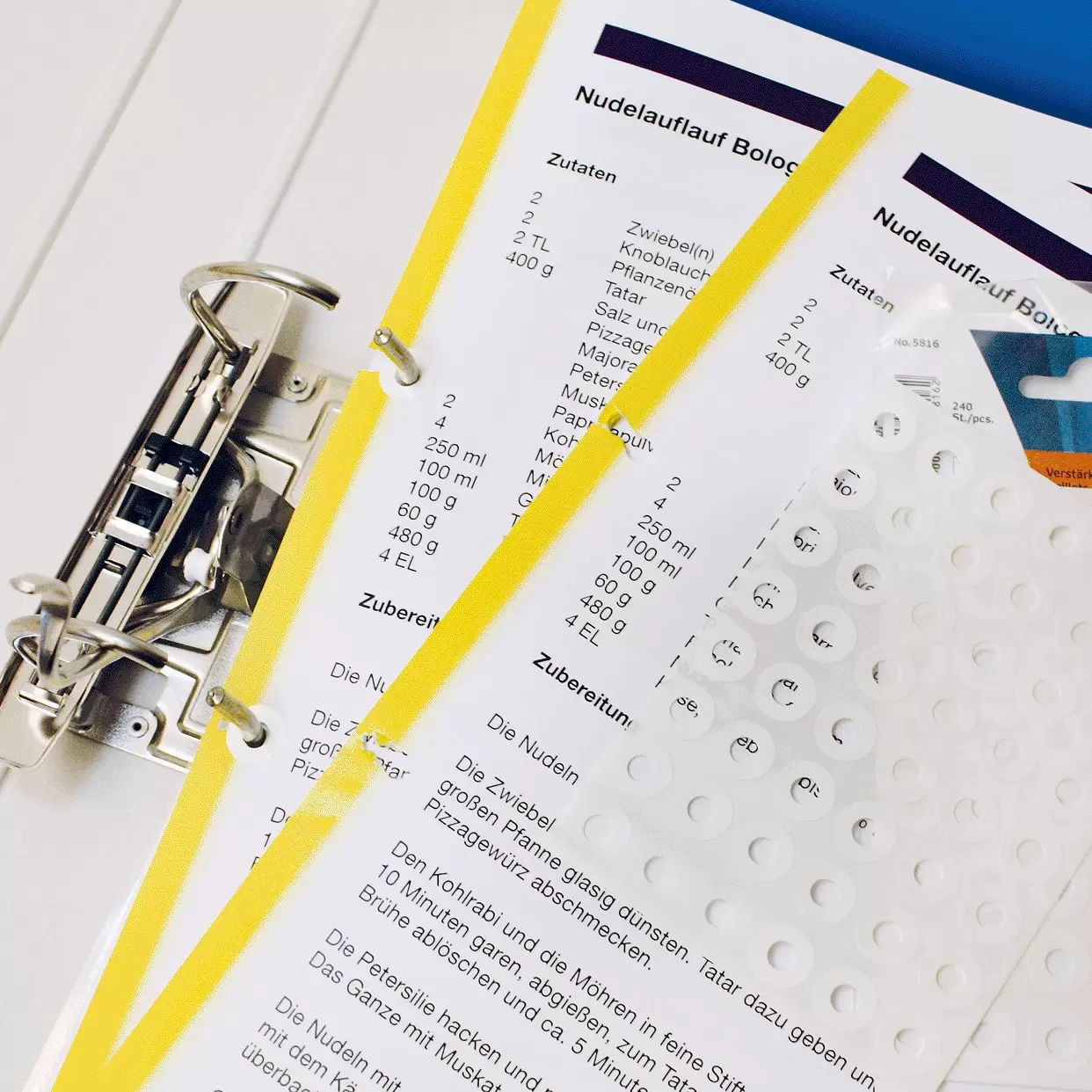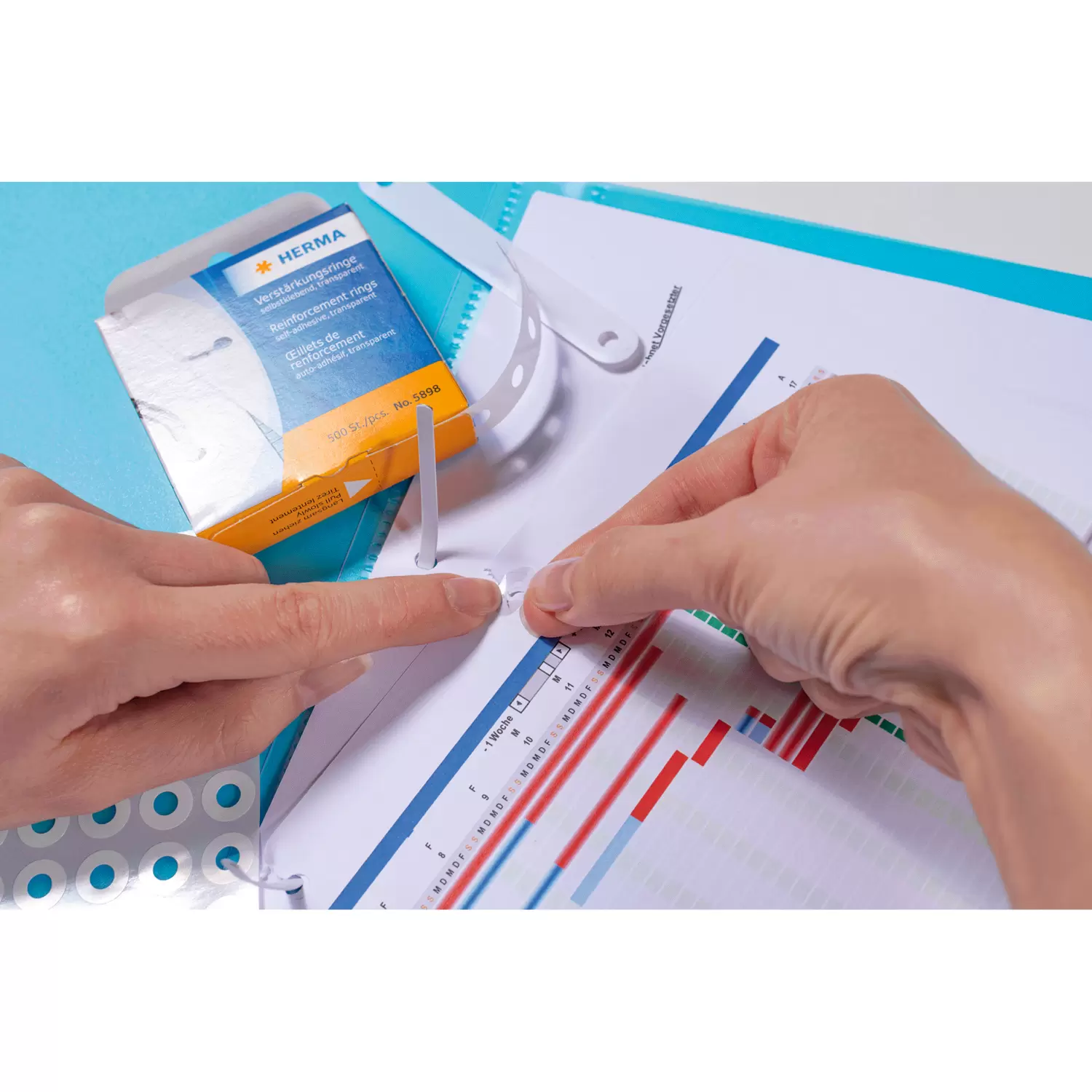 Self-adhesive reinforcement rings, made of tear-resistant transparent plastic film, for neatly and dependably reinforcing of repairing file attachment holes. Outer diameter 12mm. In functional cardboard dispenser.