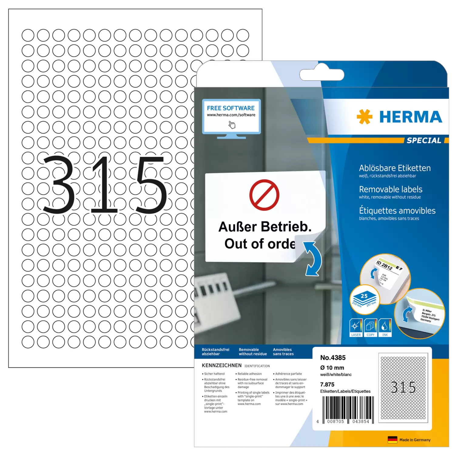 Self-adhesive labels on A4 sheets. Reliable adhesion to all smooth, dry, undamaged and dust-free surfaces. Residue-free removal without damaging the subsurface. Ideal for short-term labelling and for surfaces that must be protected from damage. Excellent printing results on all laser printers, inkjet printers, copiers, colour laser printers and colour copiers. Trouble-free processing thanks to all-round protective edge and optimum flatness. Environmentally friendly: FSC™ Mix Credit certified, chlorine-free bleached, solvent-free adhesive. Labels are 100% recyclable, dispose of as for waste paper, packaging made from recycled cardboard. Free software solutions: www.herma.com/software.
