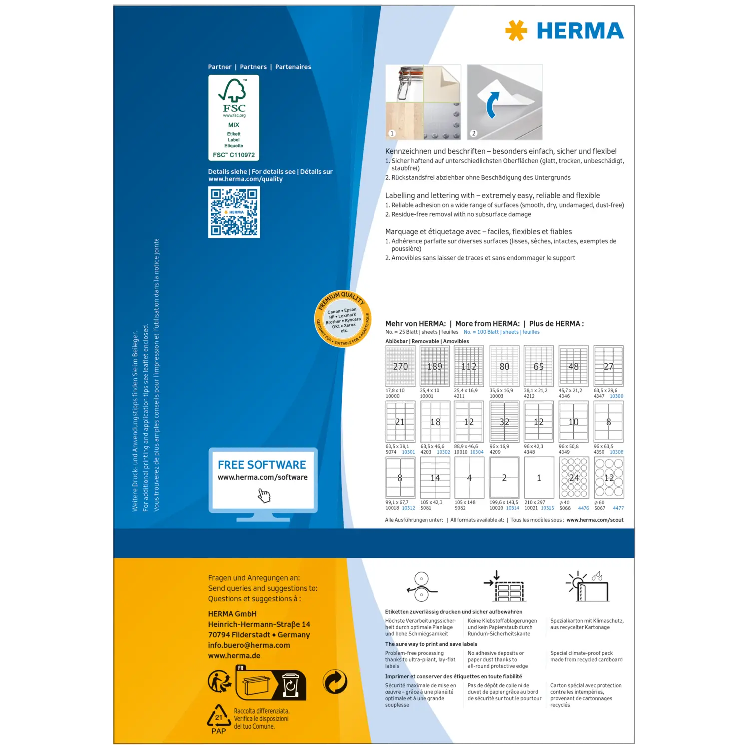 Self-adhesive labels on A4 sheets. Reliable adhesion to all smooth, dry, undamaged and dust-free surfaces. Residue-free removal without damaging the subsurface. Ideal for short-term labelling and for surfaces that must be protected from damage. Excellent printing results on all laser printers, inkjet printers, copiers, colour laser printers and colour copiers. Trouble-free processing thanks to all-round protective edge and optimum flatness. Environmentally friendly: FSC™ Mix Credit certified, chlorine-free bleached, solvent-free adhesive. Labels are 100% recyclable, dispose of as for waste paper, packaging made from recycled cardboard. Free software solutions: www.herma.com/software.