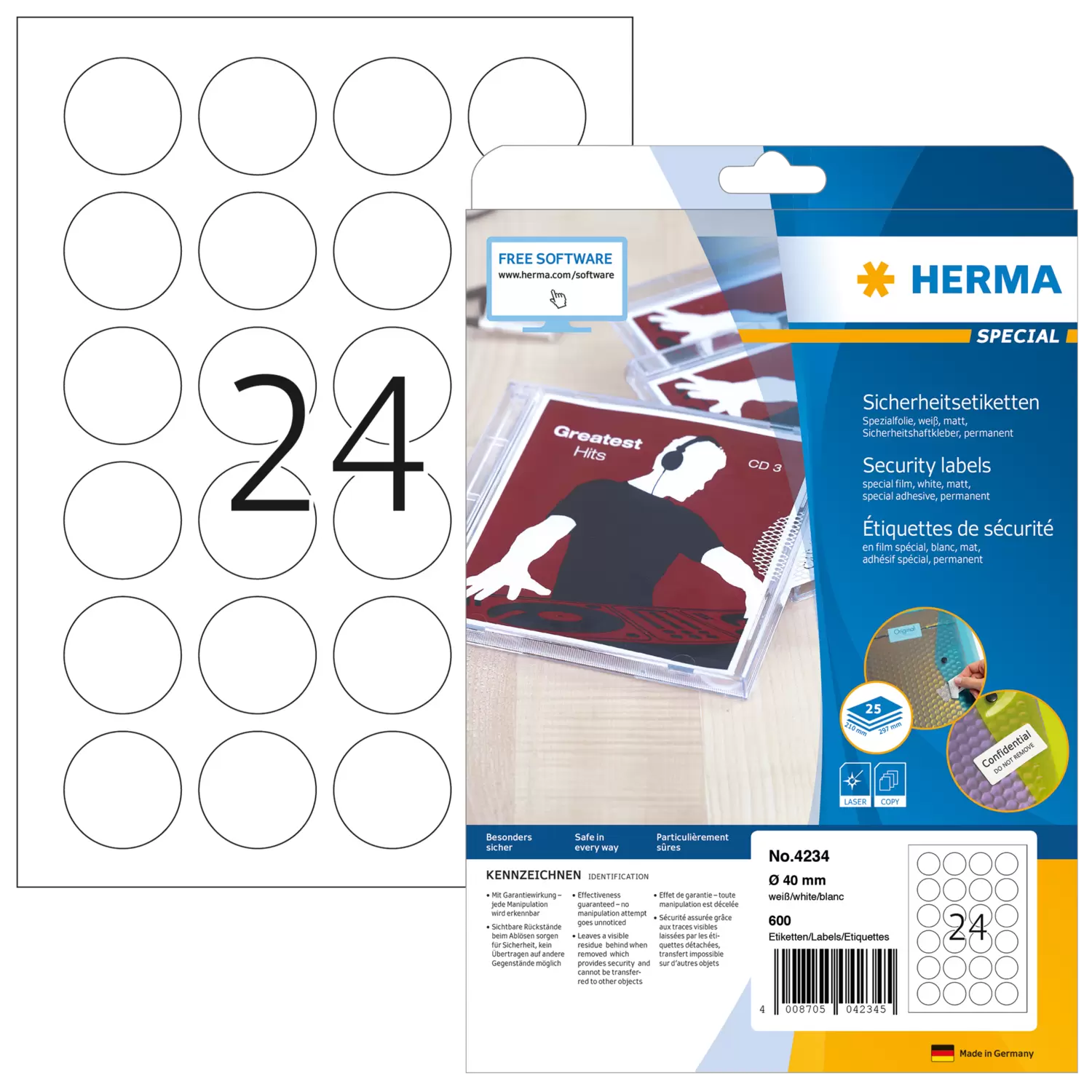 Security labels, special film to prevent tampering A4, Ø 40 mm, extremely strong adhesion