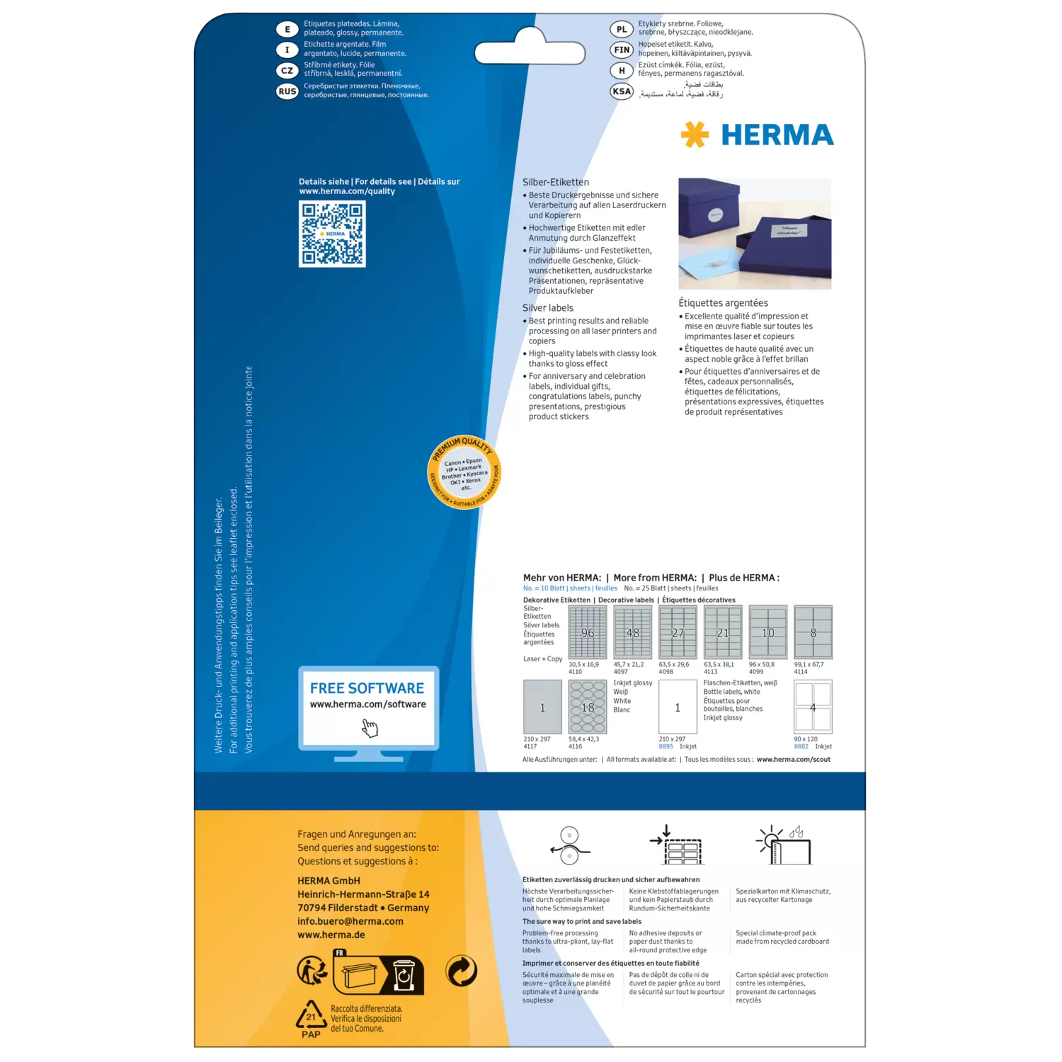 - High-quality labels with a glossy effect for exclusive appearance. Oil and dirt-repellent, wet-wipeable