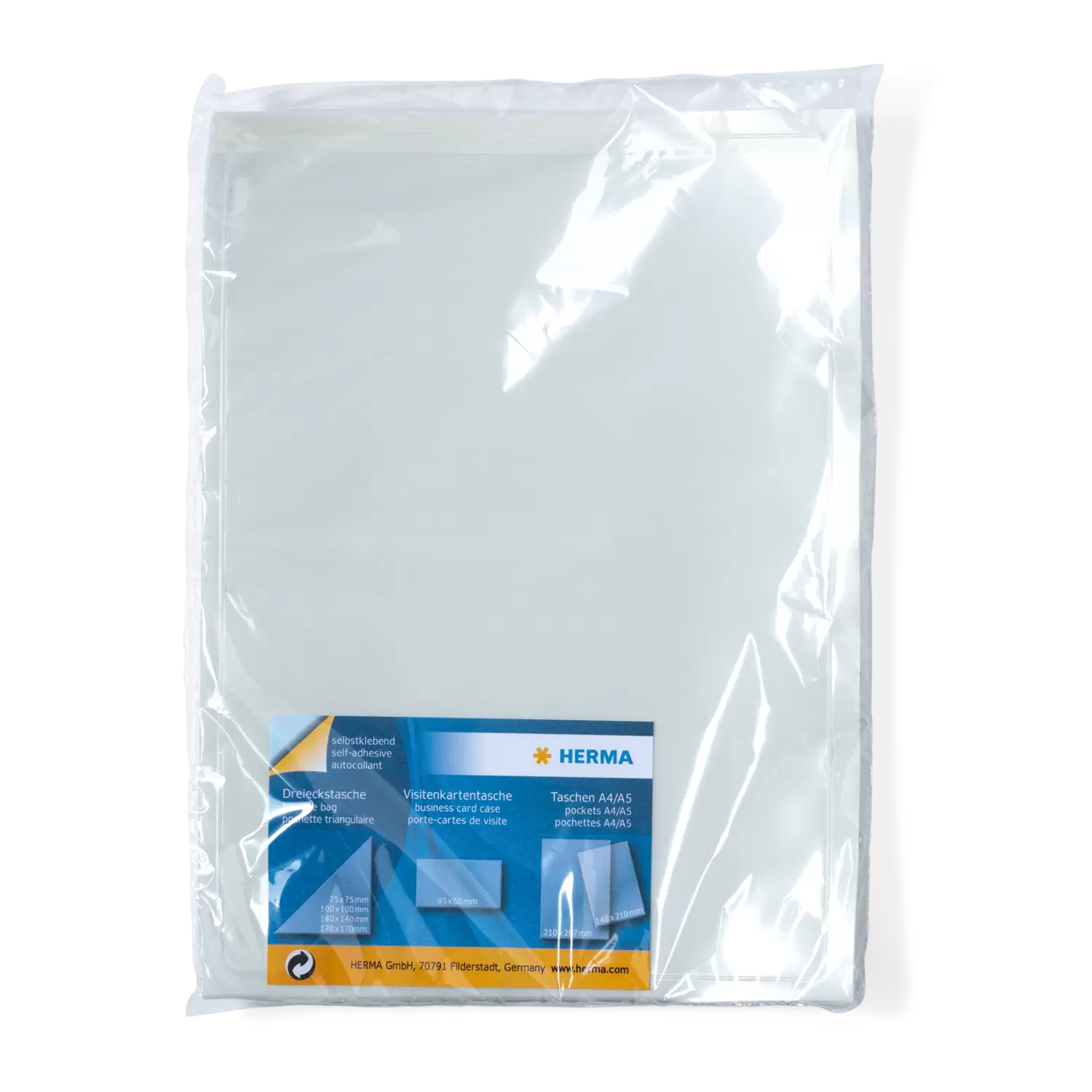 The practical extra pocket for sticking in albums, files and ring binders, offer and presentation folders: HERMA's transparent self-adhesive pockets. The pockets for A5 format (148 x 210 mm) are made of crystal-clear polypropylene film and are ideal for documents of different types. The pockets are easy to attach, self-adhesive and adhere firmly to smooth surfaces. So brochures, flyers and other papers are always at hand. Simply peel off the backing paper, stick the pocket in the position you want, insert papers and use previously unused space wisely. Clever and practical.