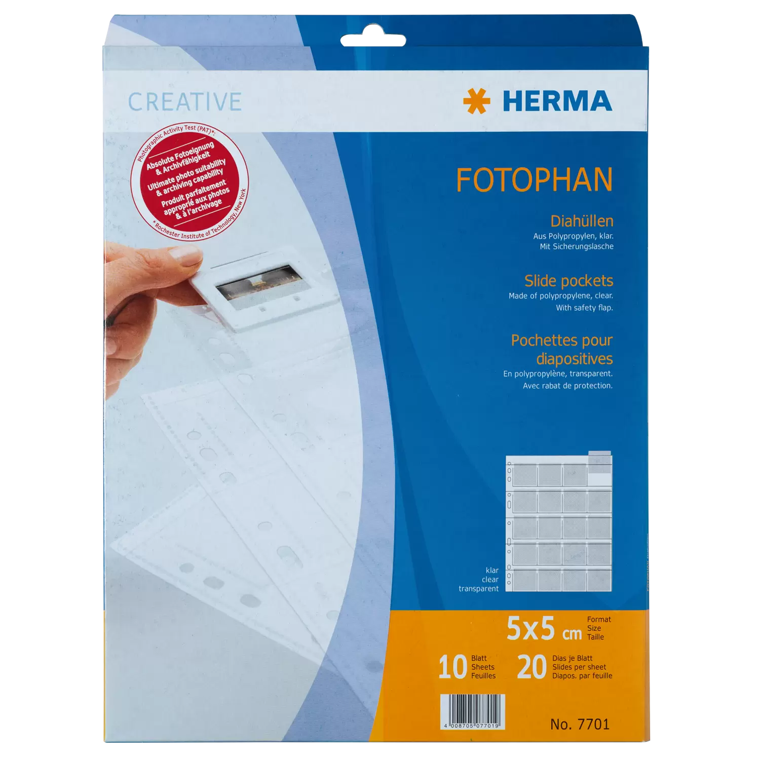 HERMA slide pockets are ideal for neat and tidy storage and archiving of 35 mm slides. They are made of transparent, robust and plasticizer-free clear matt polypropylene and offer space per pocket for 20 mounted slides in 50 x 50 mm format. The particular feature are special safety tabs that prevent the slides from falling out of the pockets. This makes it easy to insert and remove the slides and yet they are optimally protected. One pocket measures approx. 24.4 x 30.1 cm and can be easily filed in files, ring binders or photobooks thanks to the Euro perforation. For optimal protection, we recommend the 4 ring version. There are 10 pockets in a pack and thus enough space for up to 200 slides.