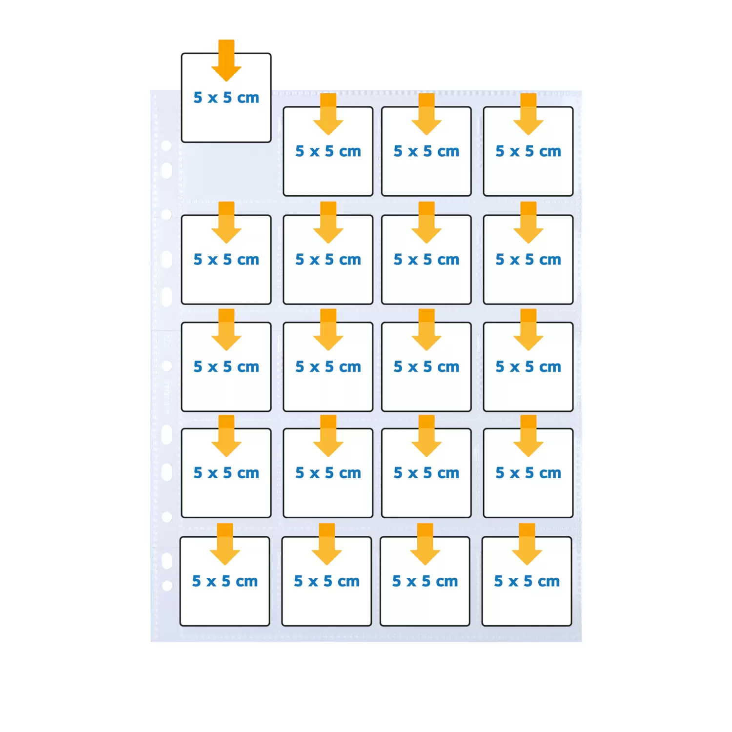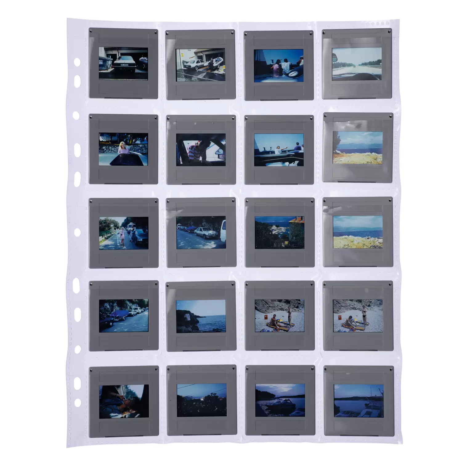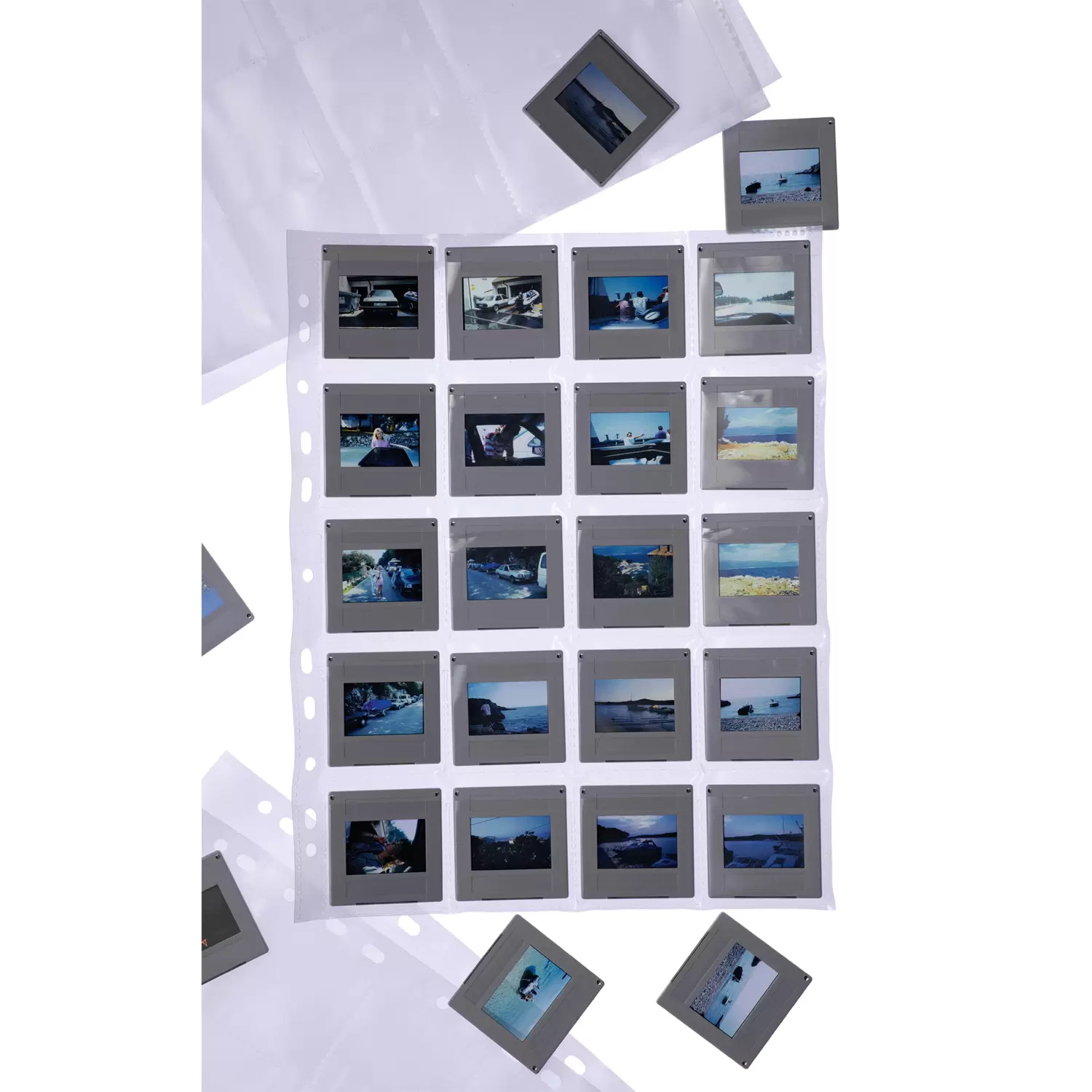 HERMA slide pockets are ideal for neat and tidy storage and archiving of 35 mm slides. They are made of transparent, robust and plasticizer-free clear matt polypropylene and offer space per pocket for 20 mounted slides in 50 x 50 mm format. The particular feature are special safety tabs that prevent the slides from falling out of the pockets. This makes it easy to insert and remove the slides and yet they are optimally protected. One pocket measures approx. 24.4 x 30.1 cm and can be easily filed in files, ring binders or photobooks thanks to the Euro perforation. For optimal protection, we recommend the 4 ring version. There are 100 pockets in a pack and thus enough space for up to 2.000 slides.