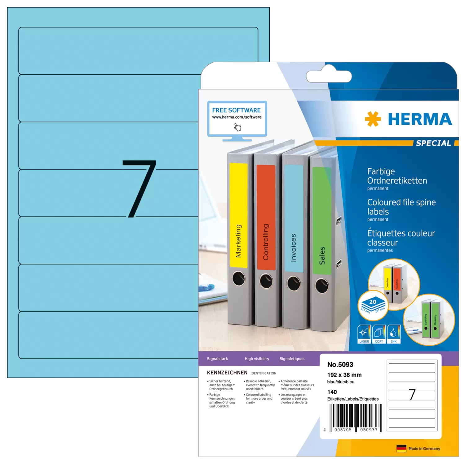 File labels A4, 192 x 38 mm, blue, for narrow files (short)