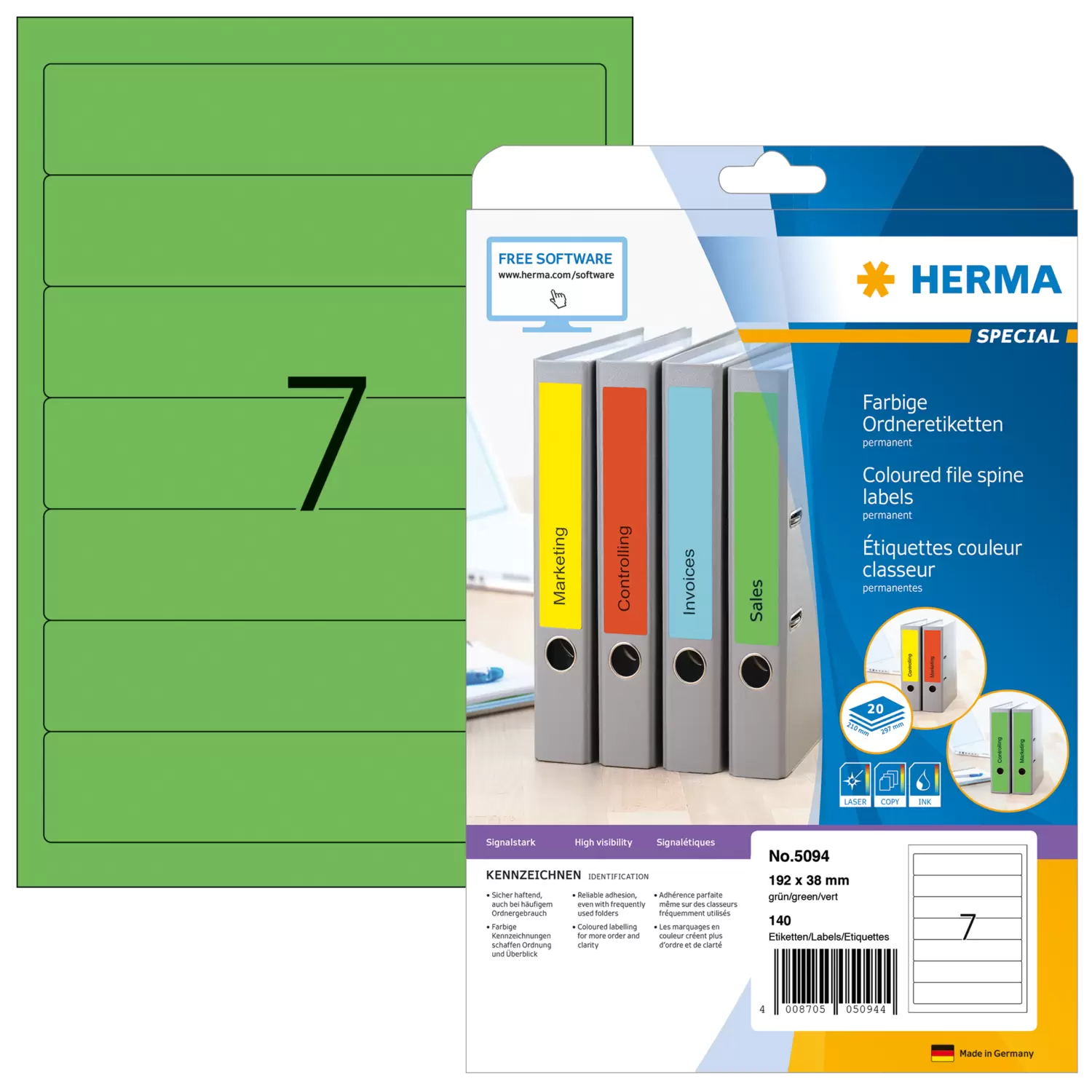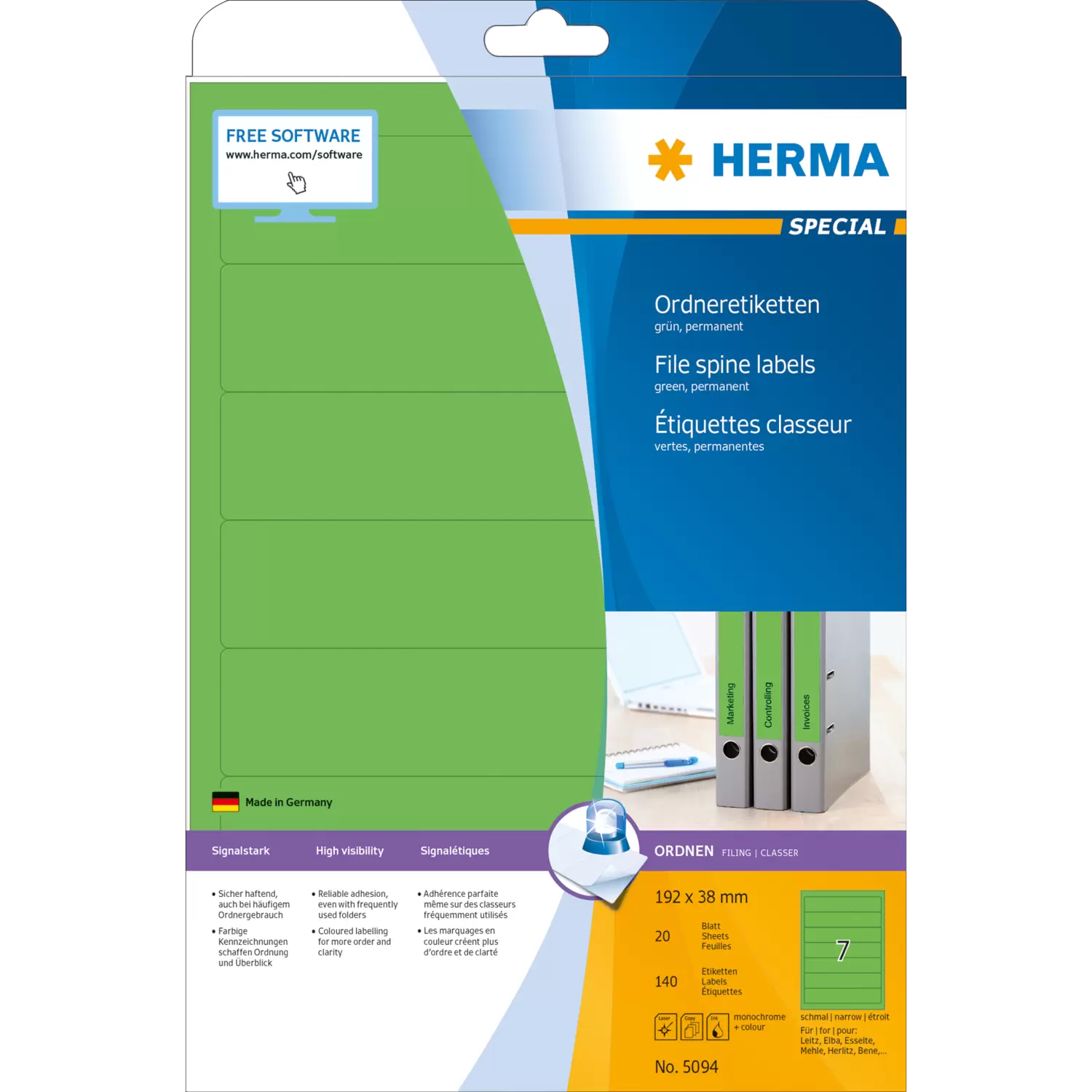 File spine labels on A4 sheets, self-adhesive. For a uniform appearance at the office and at home. For all standard files. Blank: ideal for company logos, inscriptions and organization notes. Reliable adhesion, even with frequently used files. Environmentally friendly: high-quality, chlorine-free bleached special paper, solvent-free adhesive. Labels are 100% recyclable, dispose of as for waste paper, packaging made from recycled cardboard. Excellent printing results on all laser printers, inkjet printers, copiers, colour laser printers and colour copiers. Trouble-free processing thanks to all-round protective edge and optimum flatness. Free software solutions: www.herma.com/software.
