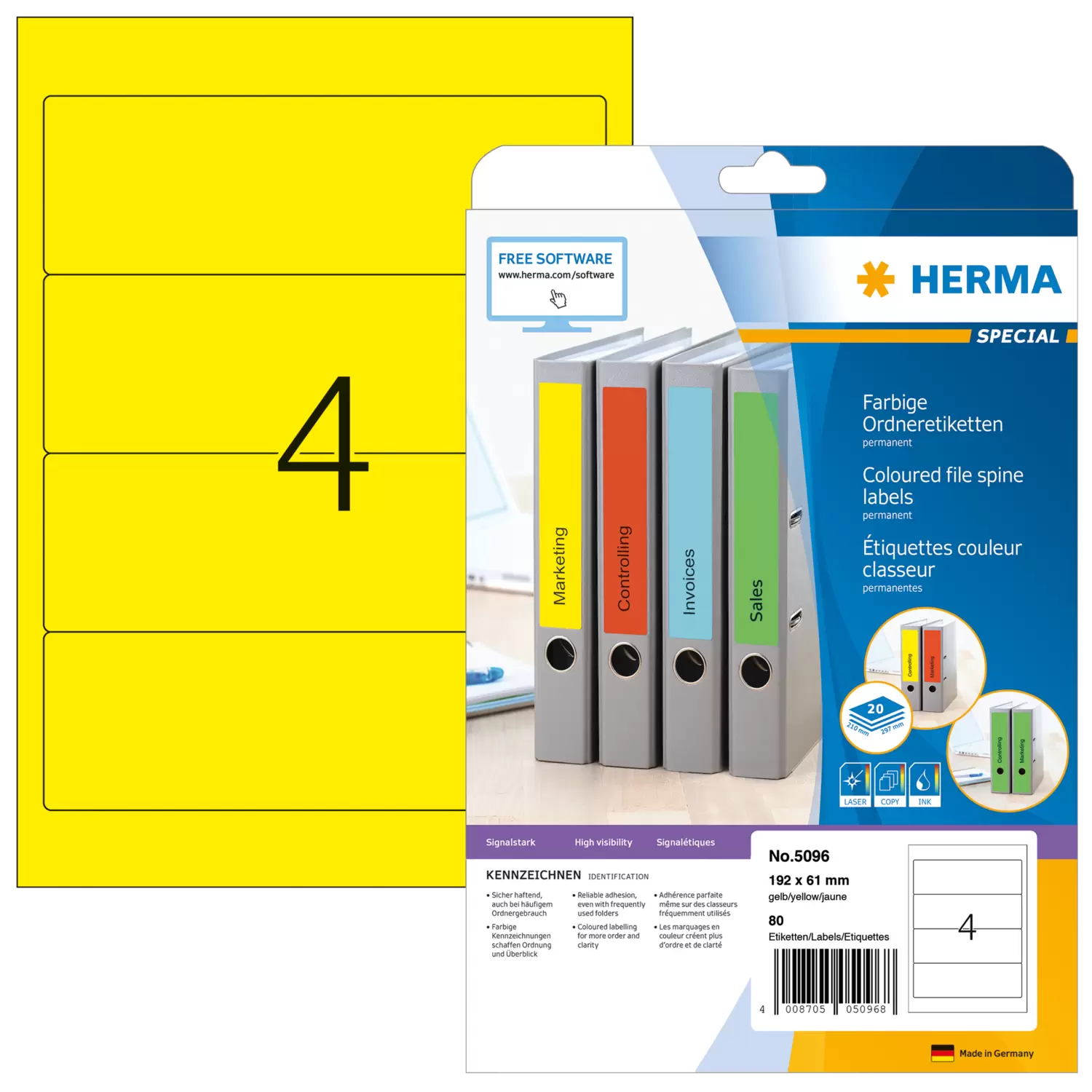 File spine labels on A4 sheets, self-adhesive. For a uniform appearance at the office and at home. For all standard files. Blank: ideal for company logos, inscriptions and organization notes. Reliable adhesion, even with frequently used files. Environmentally friendly: high-quality, chlorine-free bleached special paper, solvent-free adhesive. Labels are 100% recyclable, dispose of as for waste paper, packaging made from recycled cardboard. Excellent printing results on all laser printers, inkjet printers, copiers, colour laser printers and colour copiers. Trouble-free processing thanks to all-round protective edge and optimum flatness. Free software solutions: www.herma.com/software.