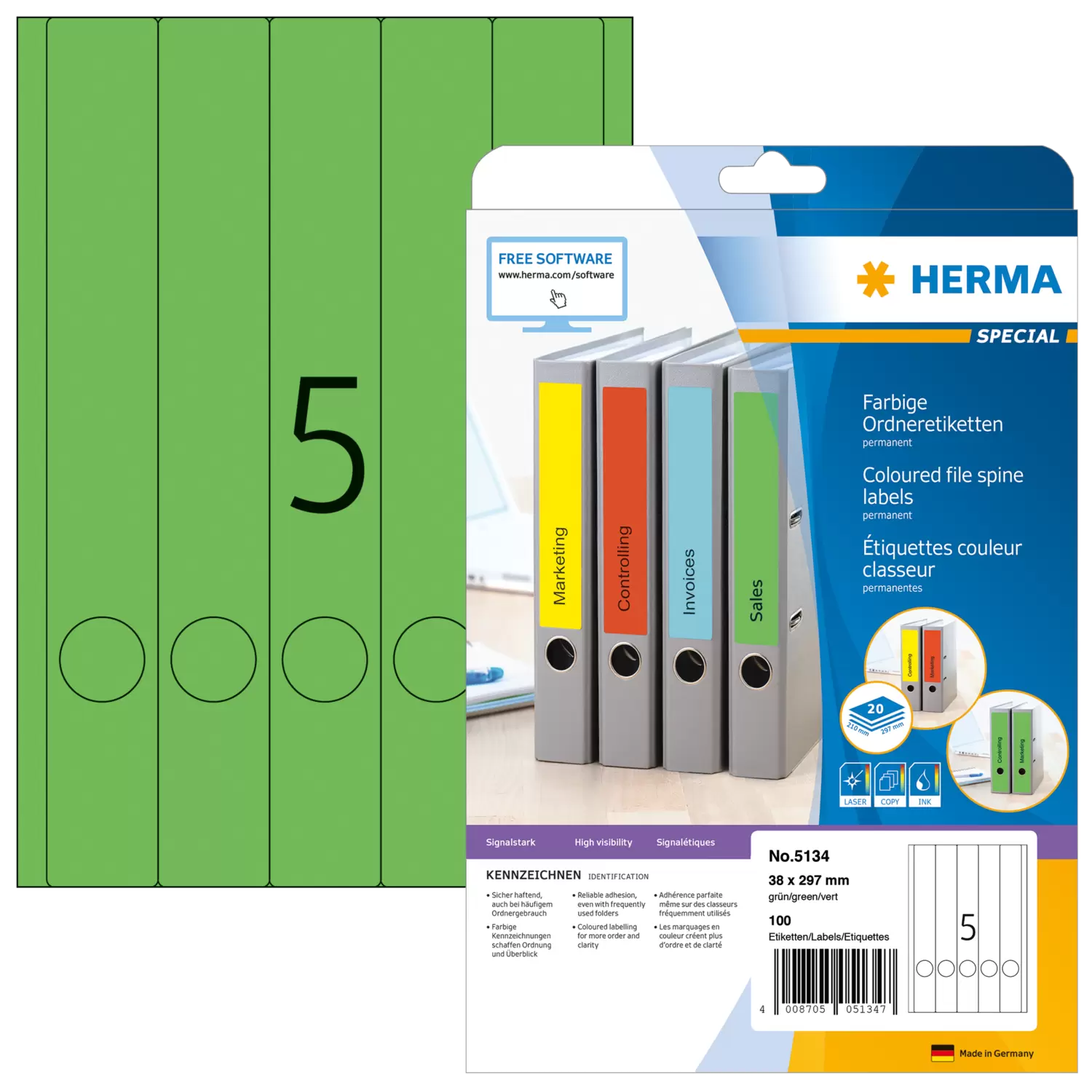 File labels A4, 38 x 297 mm, green, for narrow files (long)