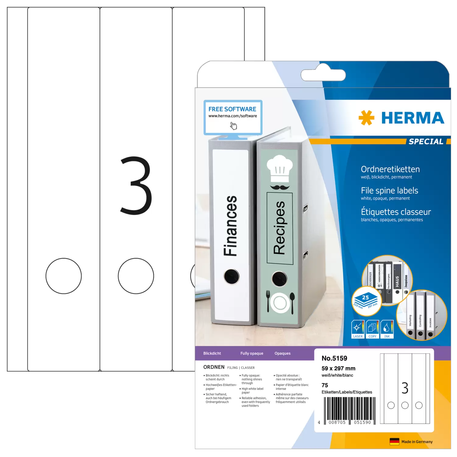 File labels A4, 59 x 297 mm, white, opaque, for narrow files (short)
