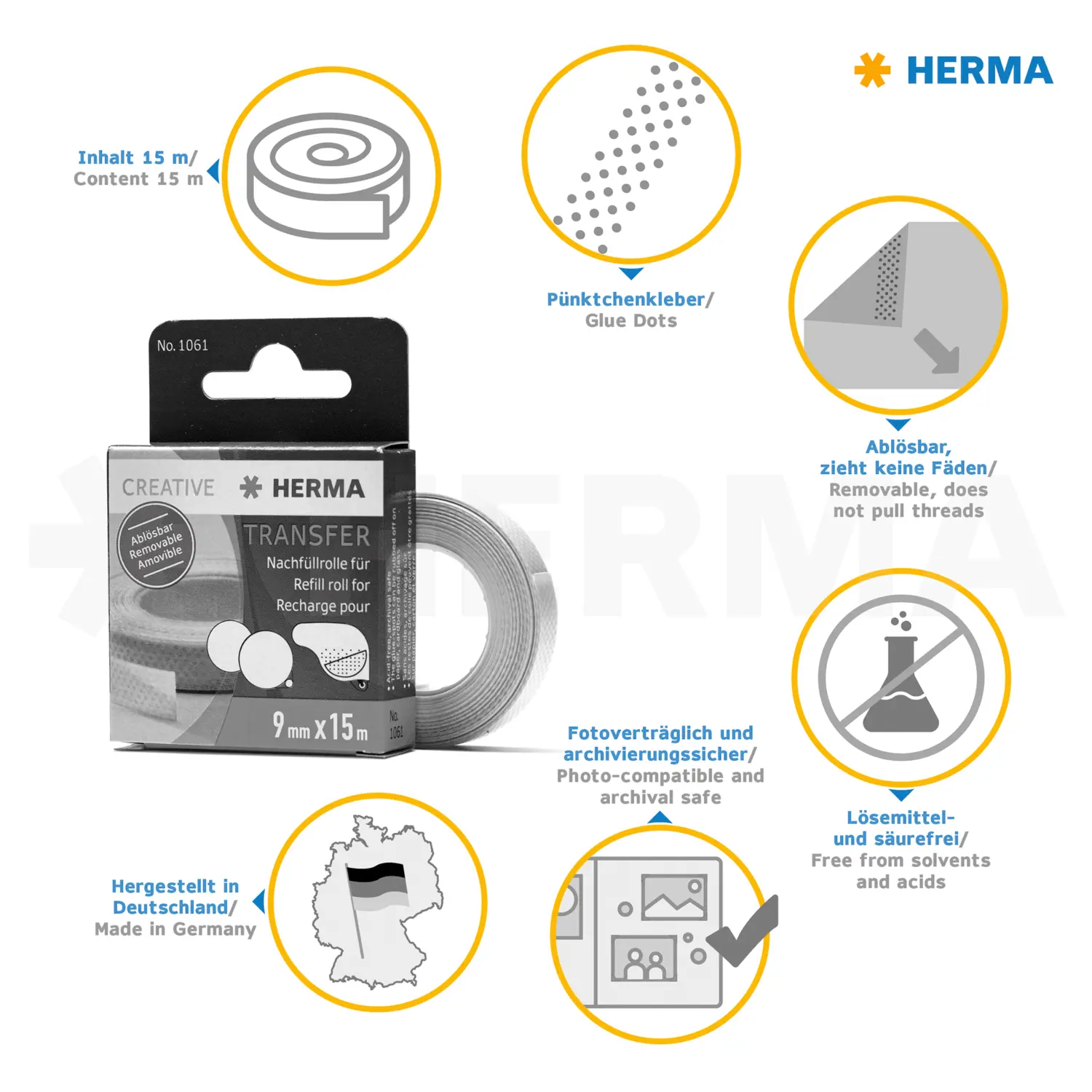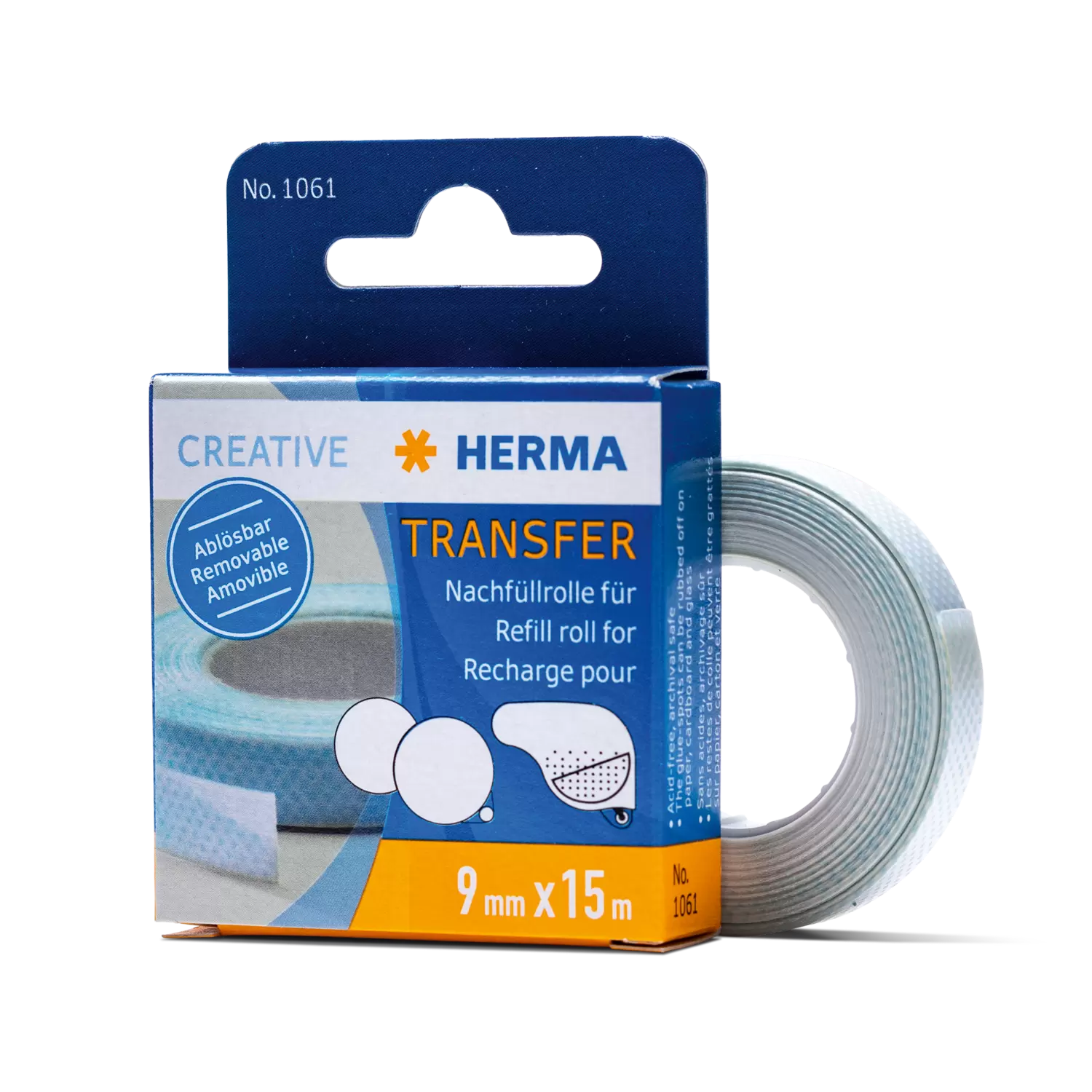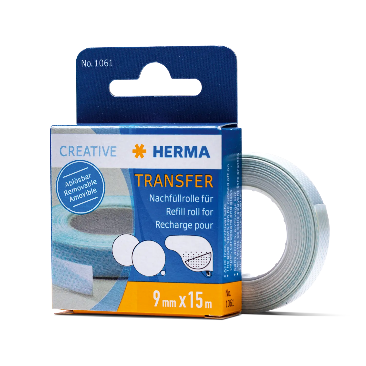 With the practical HERMA refill roll for the Glue dispensers Transfer removable 1060 (black) and 1067 (blue), the glue dispenser is quickly ready for use again when the roll is empty. The dispenser is easy to open and the new roll can be inserted without any complications. Refill and reuse instead of replacing - this is sustainable and environmentally friendly.