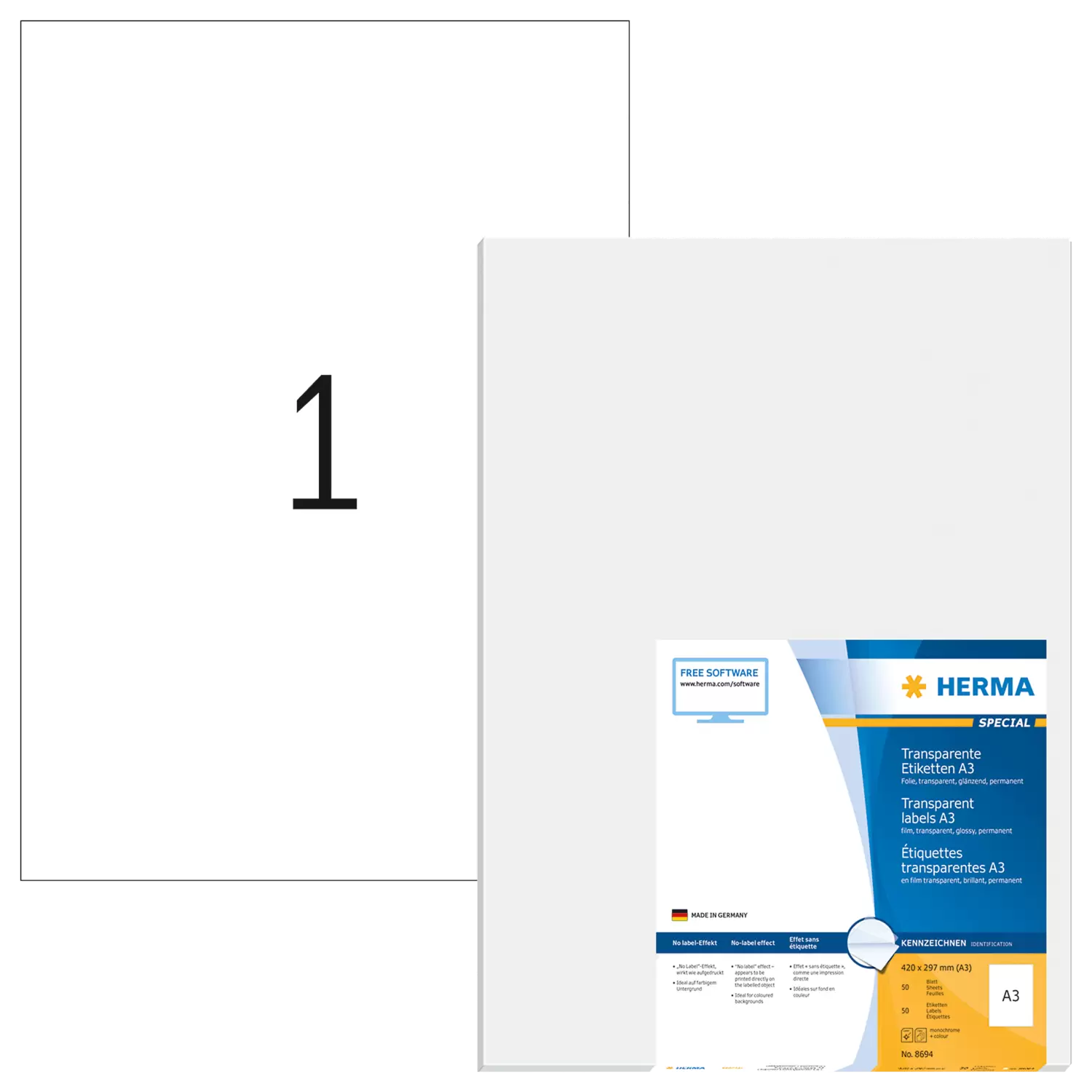 Transparent film labels, crystal-clear A3, 297 x 420 mm, weatherproof, permanent adhesion