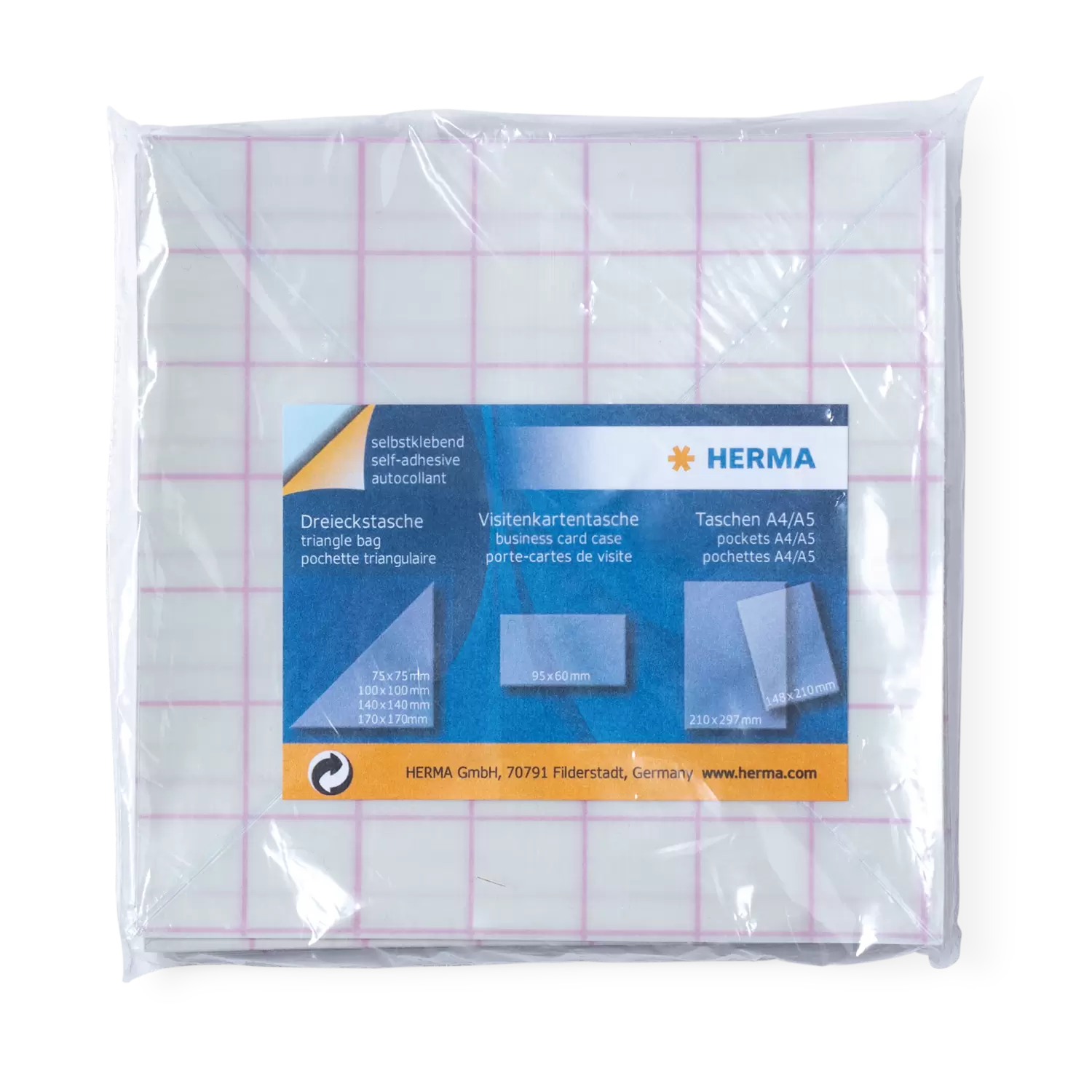 The practical extra pocket for sticking in albums, files and ring binders, offer and presentation folders: HERMA's transparent self-adhesive pouches. The triangular pouches, also known as adhesive corners or book card pockets, are made of crystal-clear polypropylene film with a side length of 10 cm, making them ideal for smaller documents such as business cards or flyers, brochures and overview sheets in smaller formats. The triangular pouches are easy to attach, self-adhesive and adhere firmly to smooth surfaces. So documents that are often used such as calendars, timetables or To Do Lists, but also business cards or brochures for business appointments are always at hand. Simply peel off the backing paper, stick the triangular pocket in the position you want, insert the papers and use previously unused space wisely. Clever and practical.