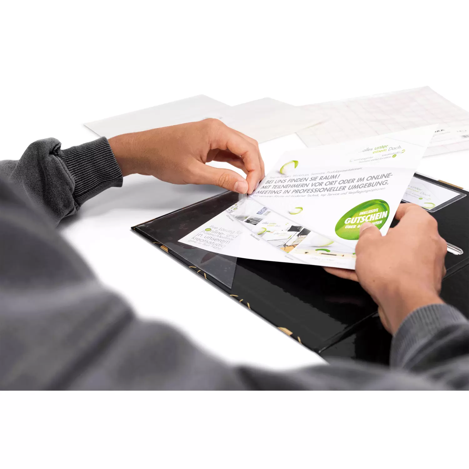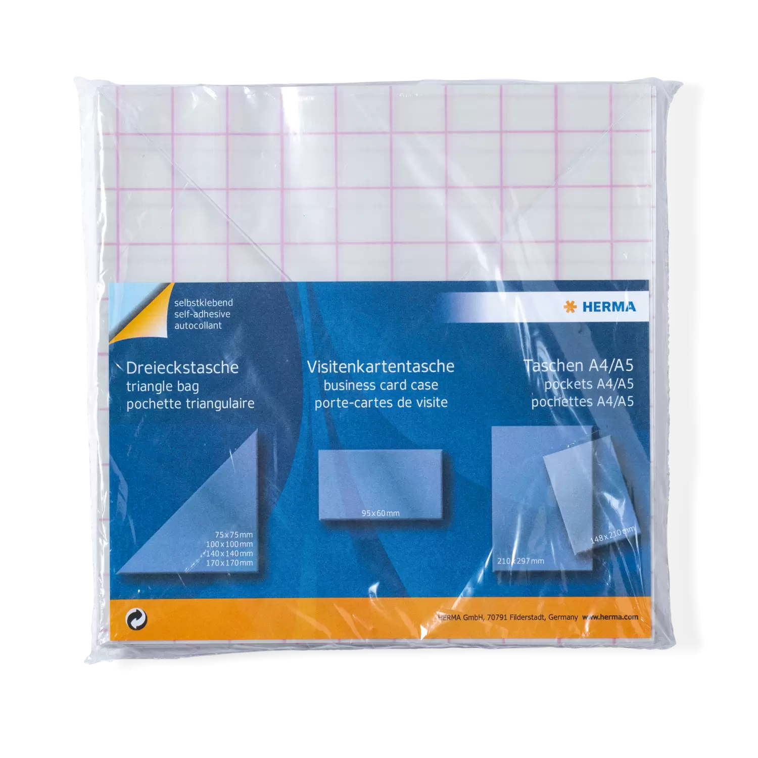 The practical extra pocket for sticking in albums, files and ring binders, offer and presentation folders: HERMA's transparent self-adhesive pouches. The triangular pouches, also known as adhesive corners or book card pockets, are made of crystal-clear polypropylene film with a side length of 14 cm, making them ideal for smaller documents such as business cards or flyers, brochures and overview sheets. The triangular pouches are easy to attach, self-adhesive and adhere firmly to smooth surfaces. So documents that are often used such as calendars, timetables or To Do Lists, but also business cards or brochures for business appointments are always at hand. Simply peel off the backing paper, stick the triangular pocket in the position you want, insert the papers and use previously unused space wisely. Clever and practical.