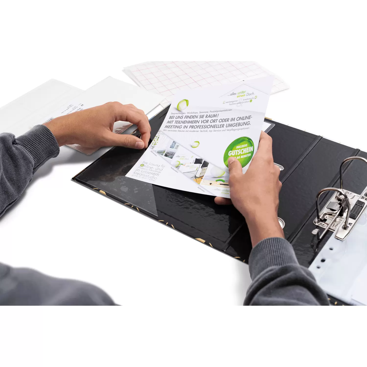 The practical extra pocket for sticking in albums, files and ring binders, offer and presentation folders: HERMA's transparent self-adhesive pouches. The triangular pouches, also known as adhesive corners or book card pockets, are made of crystal-clear polypropylene film with a side length of 17 cm, making them ideal for smaller documents such as business cards or flyers, brochures and overview sheets. The triangular pouches are easy to attach, self-adhesive and adhere firmly to smooth surfaces. So documents that are often used such as calendars, timetables or To Do Lists, but also business cards or brochures for business appointments are always at hand. Simply peel off the backing paper, stick the triangular pocket in the position you want, insert the papers and use previously unused space wisely. Clever and practical.