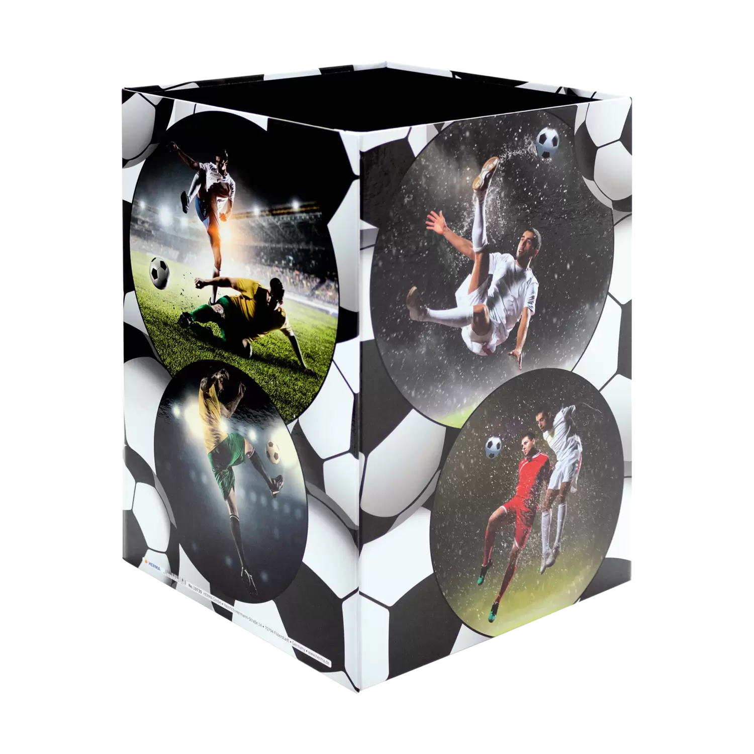 This cool designed waste paper bin is the hit for all soccer fans! Practical and beautiful to look at, a real eye-catcher under the desk. The waste paper bin is made of sturdy cardboard and has a capacity of 15 liters, so it fits under any desk. The coated surface makes it wipeable and easy to clean. Keeping things tidy is easy, even in the children's room. With HERMA. Discover the products of the popular soccer series: folders, motif files, desk pads, stickers and more! Lovingly designed, popular with boys and girls - a highlight in the children's room.