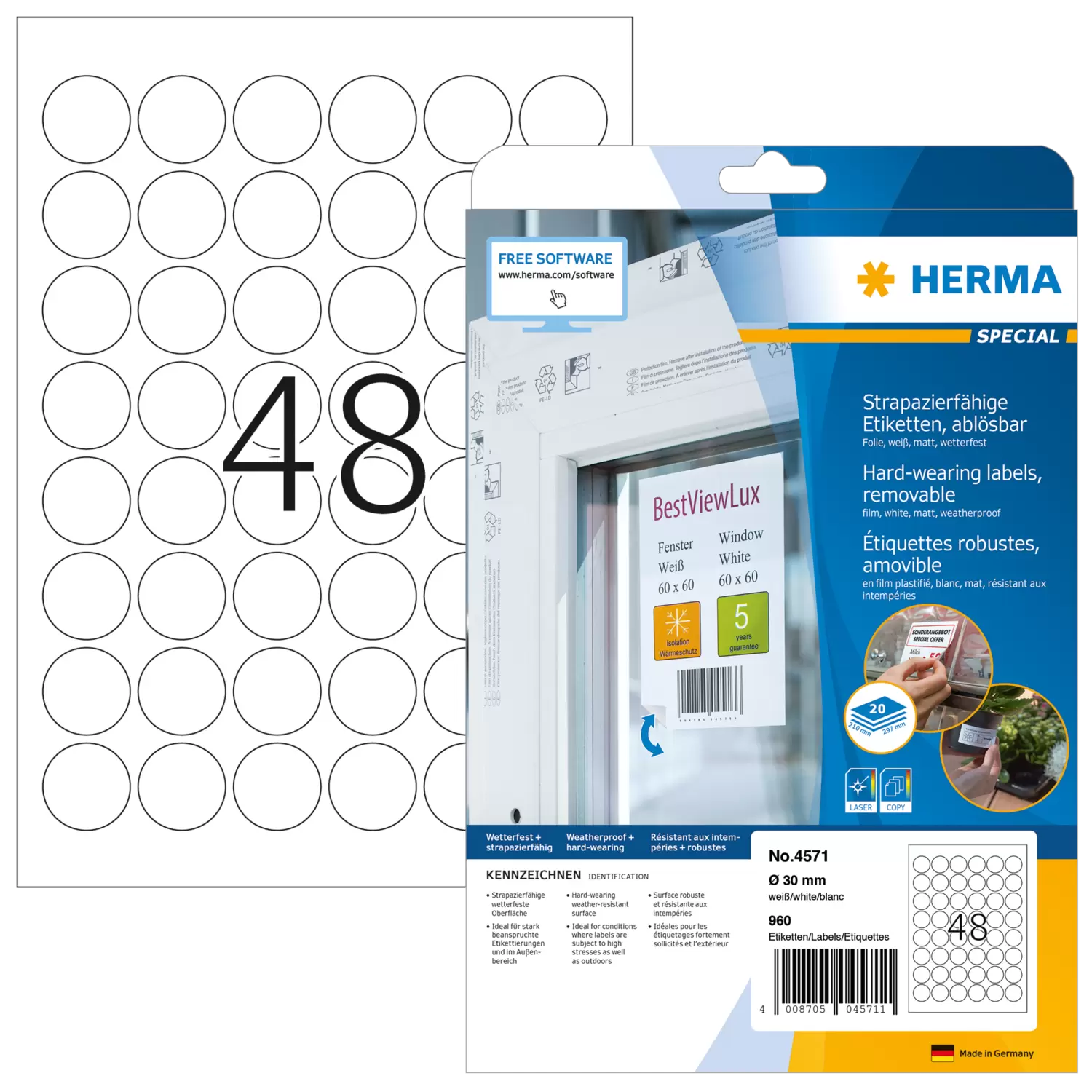 Weatherproof film labels A4, Ø 30 mm, white, removable